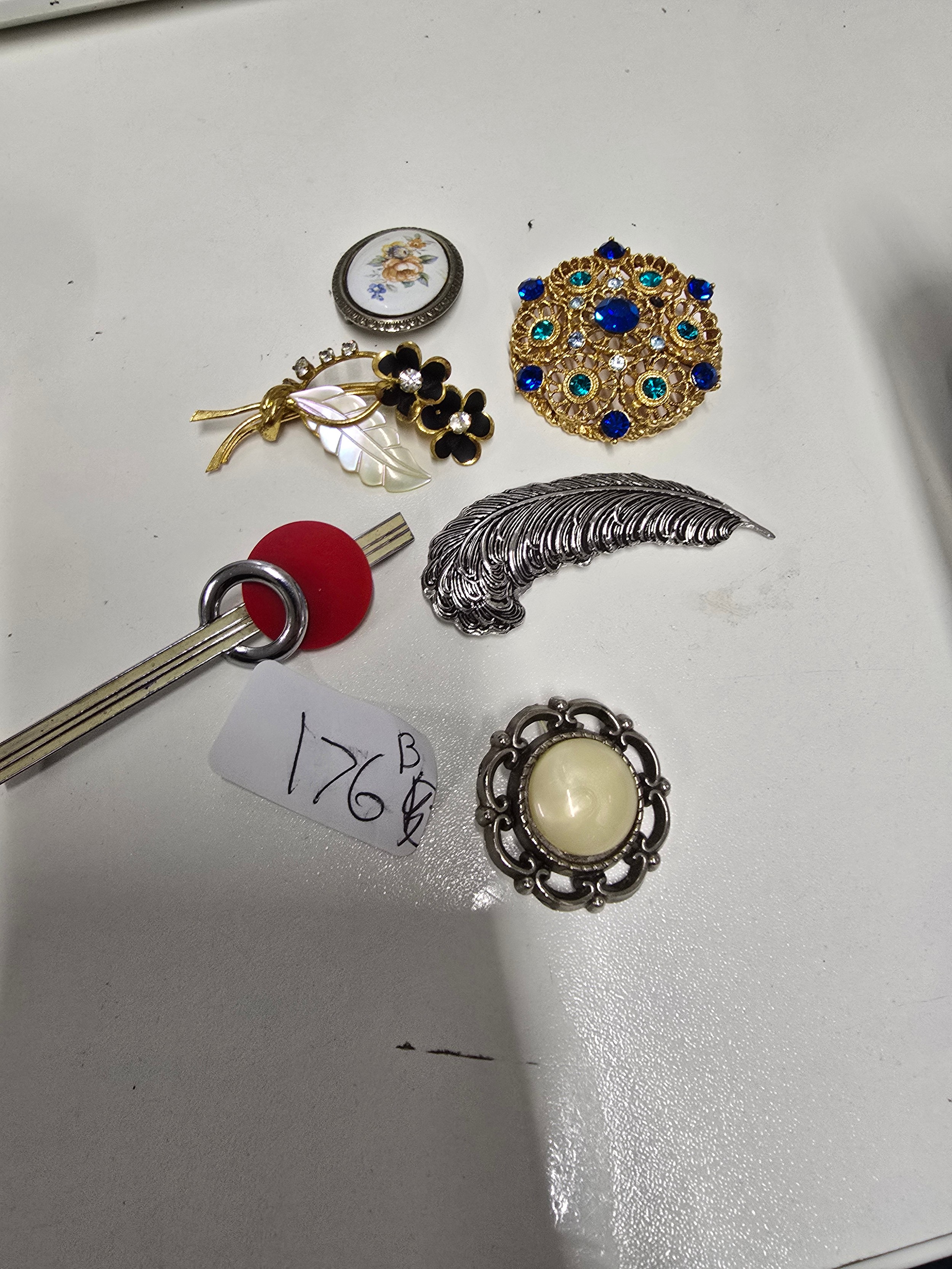 Six assorted vintage brooches in various metals and styles, including floral, filigree, and feather designs.
