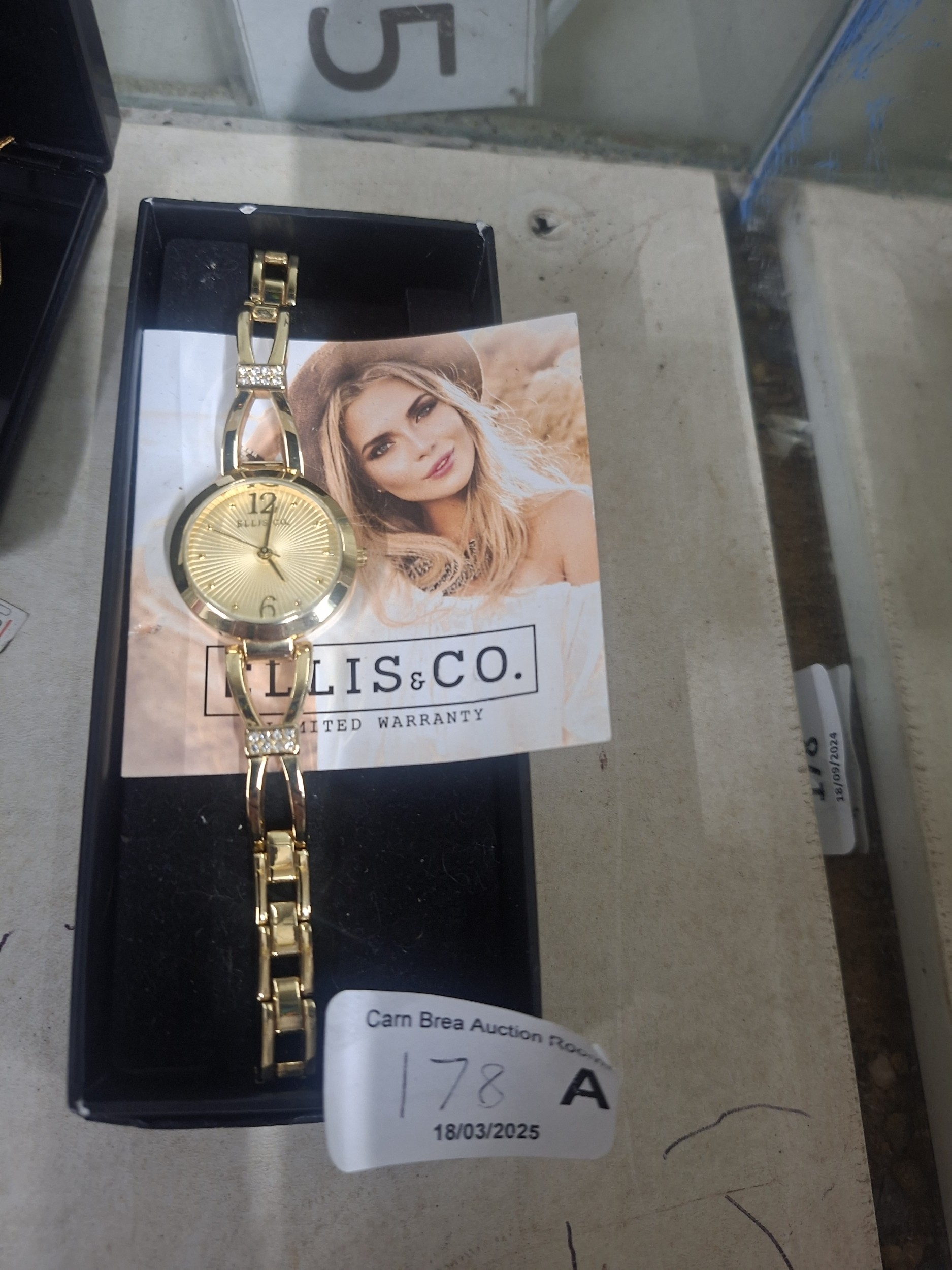 Gold-toned women’s wristwatch with sunburst dial, Roman numerals, and stone-set bezel, in box.