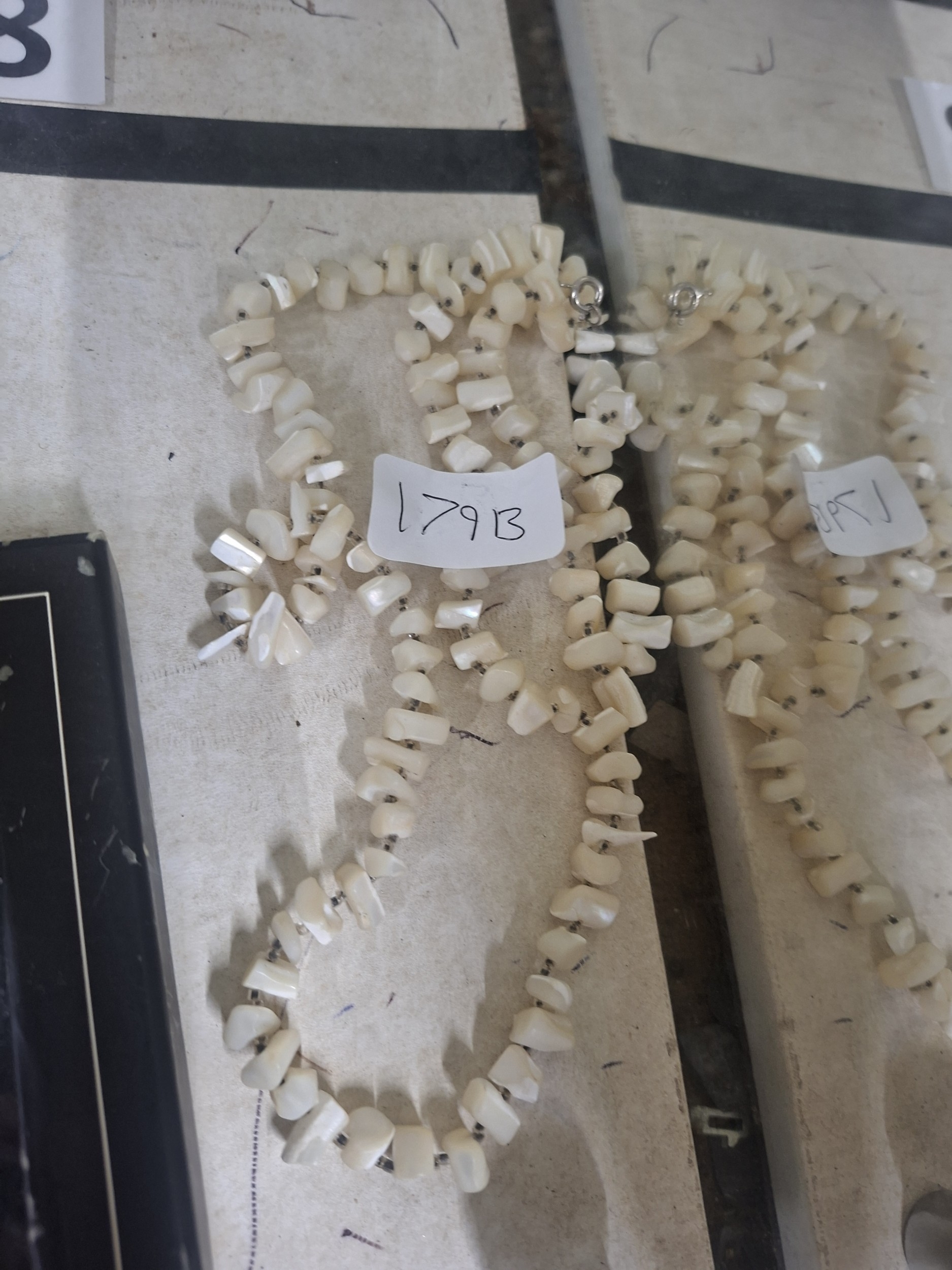 Set includes an off-white pearl bead necklace and a smaller matching brooch, both strung on dark gray wire.