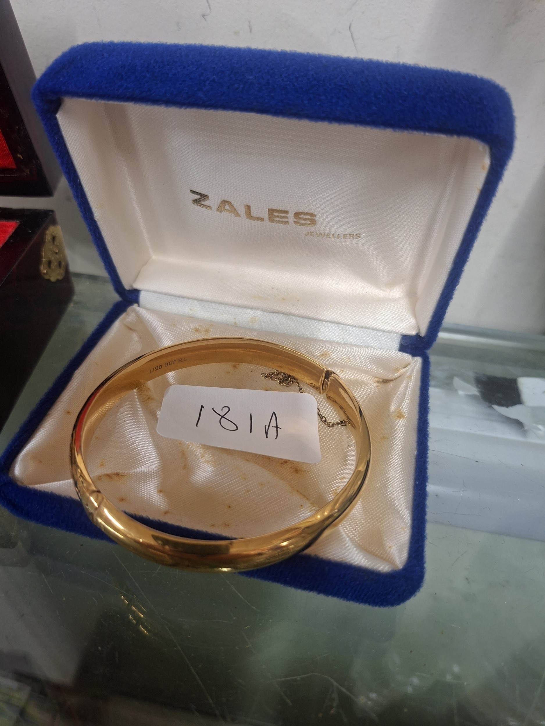 A simple, solid gold bangle bracelet inscribed “1/20 9CT R6” in a Zales jewelers box.
