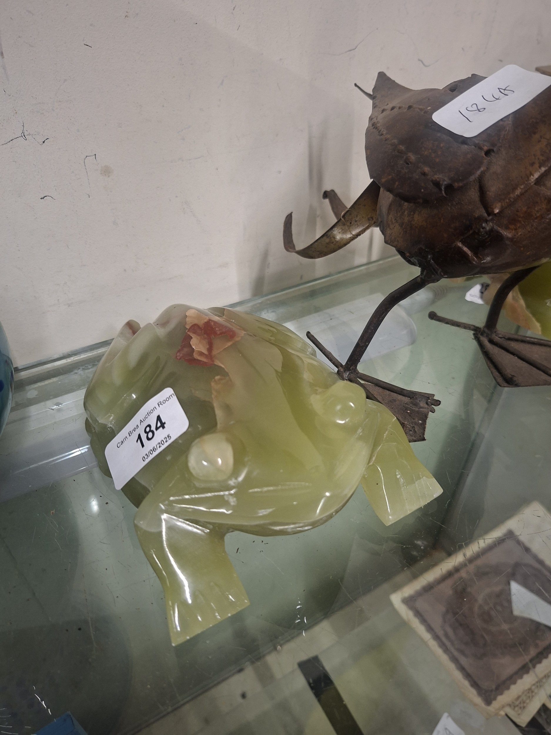 A sculpted pale green onyx frog with reddish-brown markings and minor scratches.