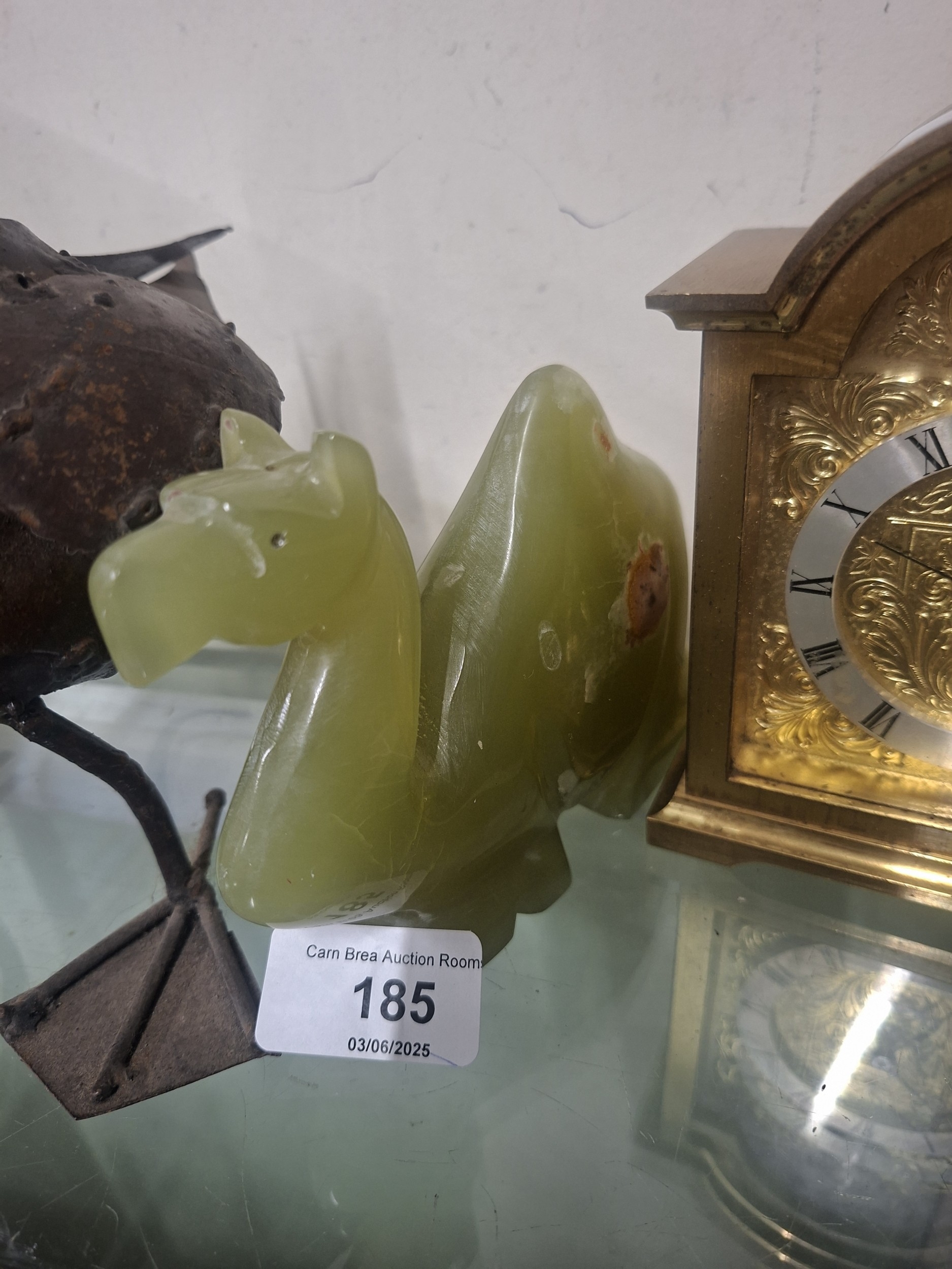 A roughly sculpted, pale greenish-yellow stone camel figurine with darker brown inclusions, showing minor surface scratches.