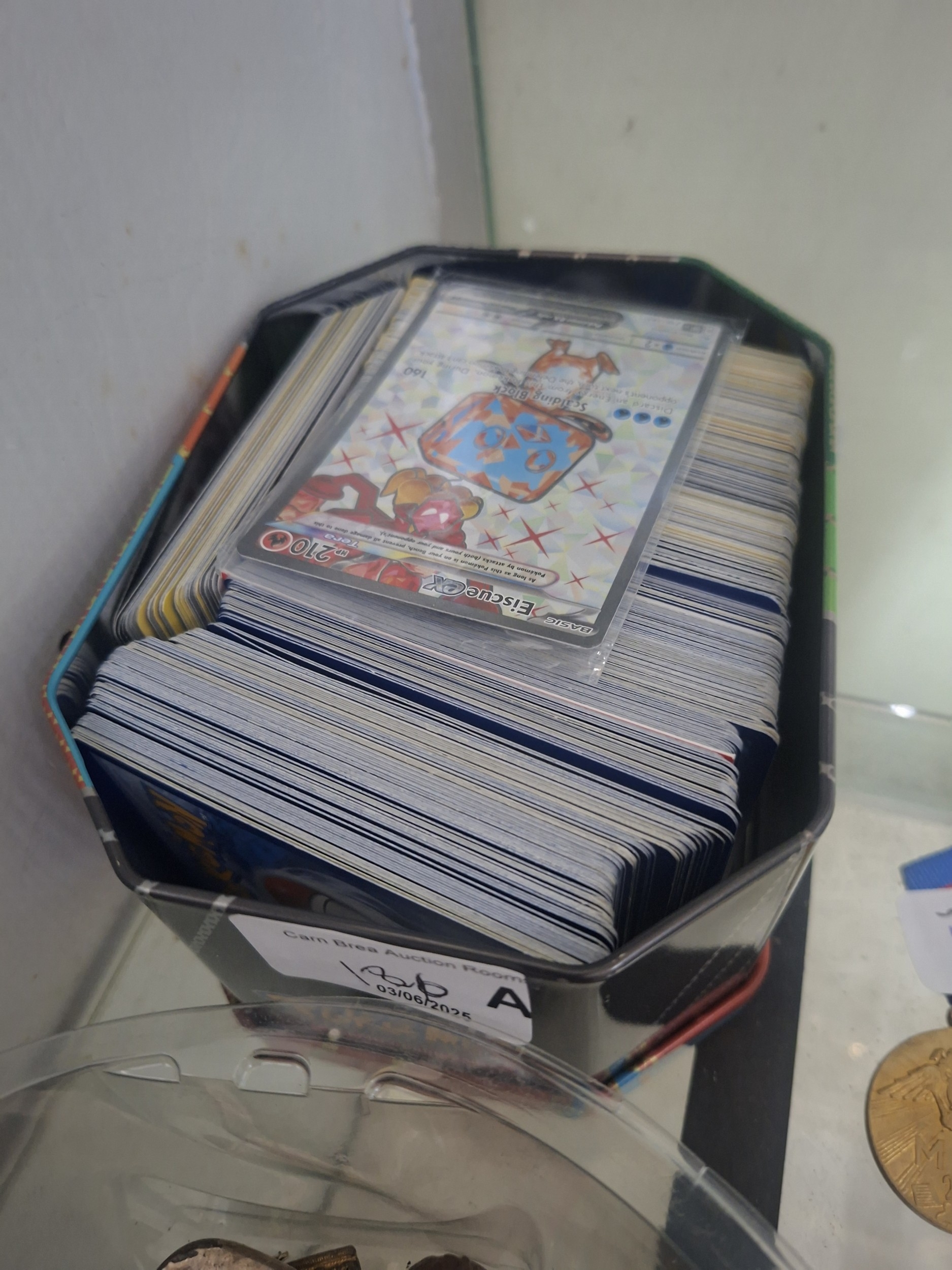 A dark tin containing a stack of Pokémon trading cards, including an Eiscue ex card, is offered.