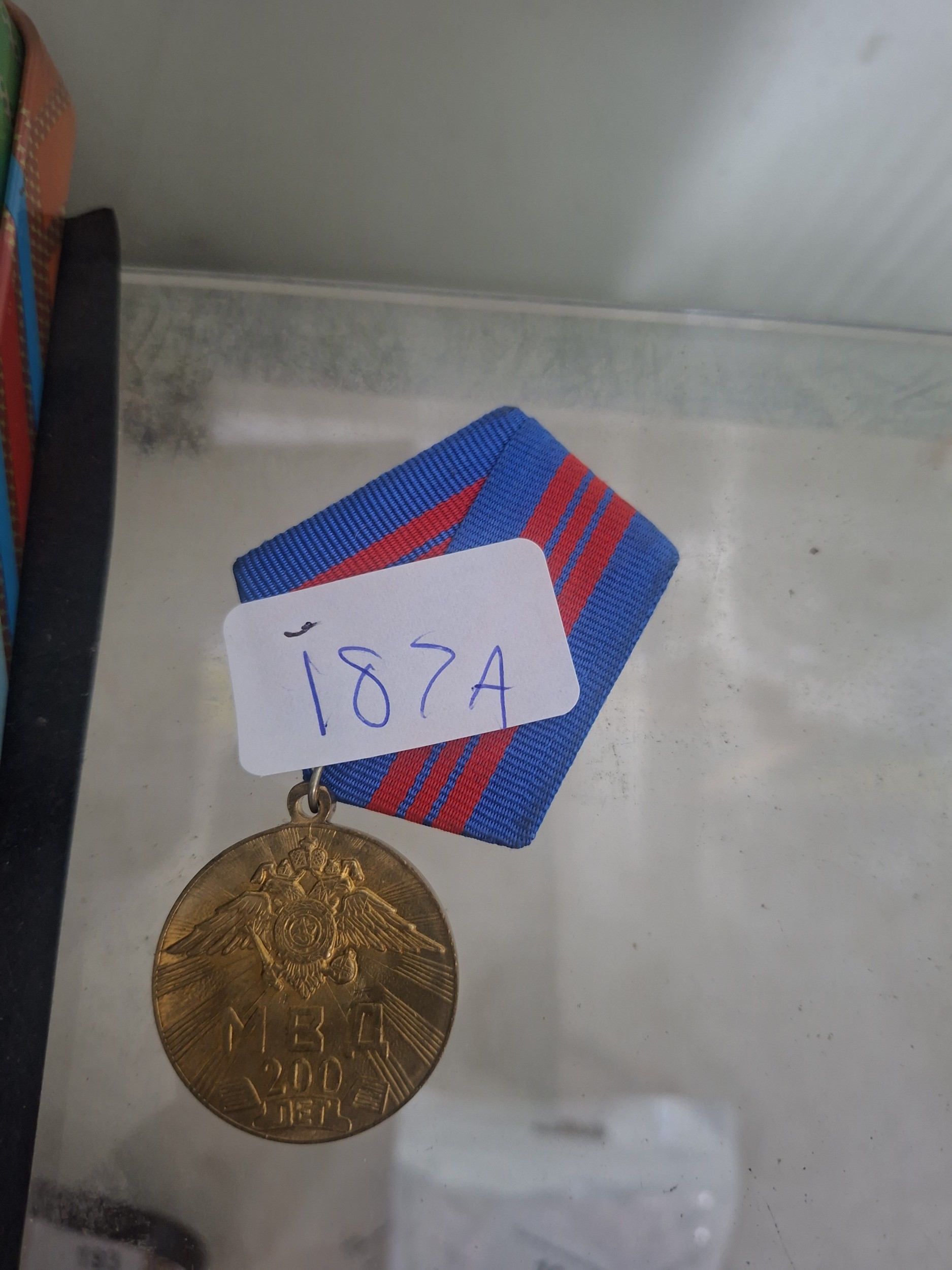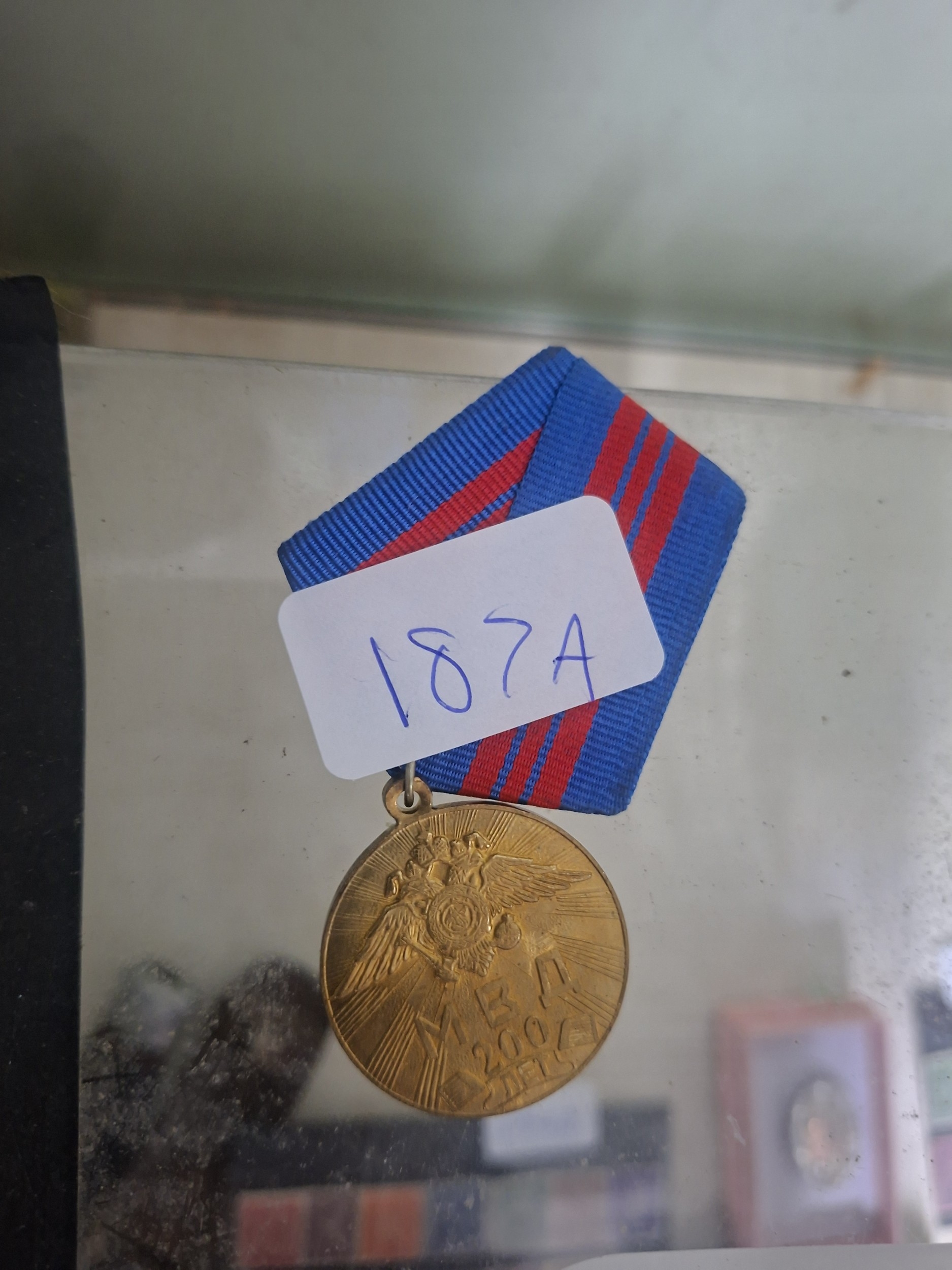 Gold-colored medal commemorating the 200th anniversary of the Russian Ministry of Internal Affairs (MVD), showing a double-headed eagle and Cyrillic script, with minor wear.