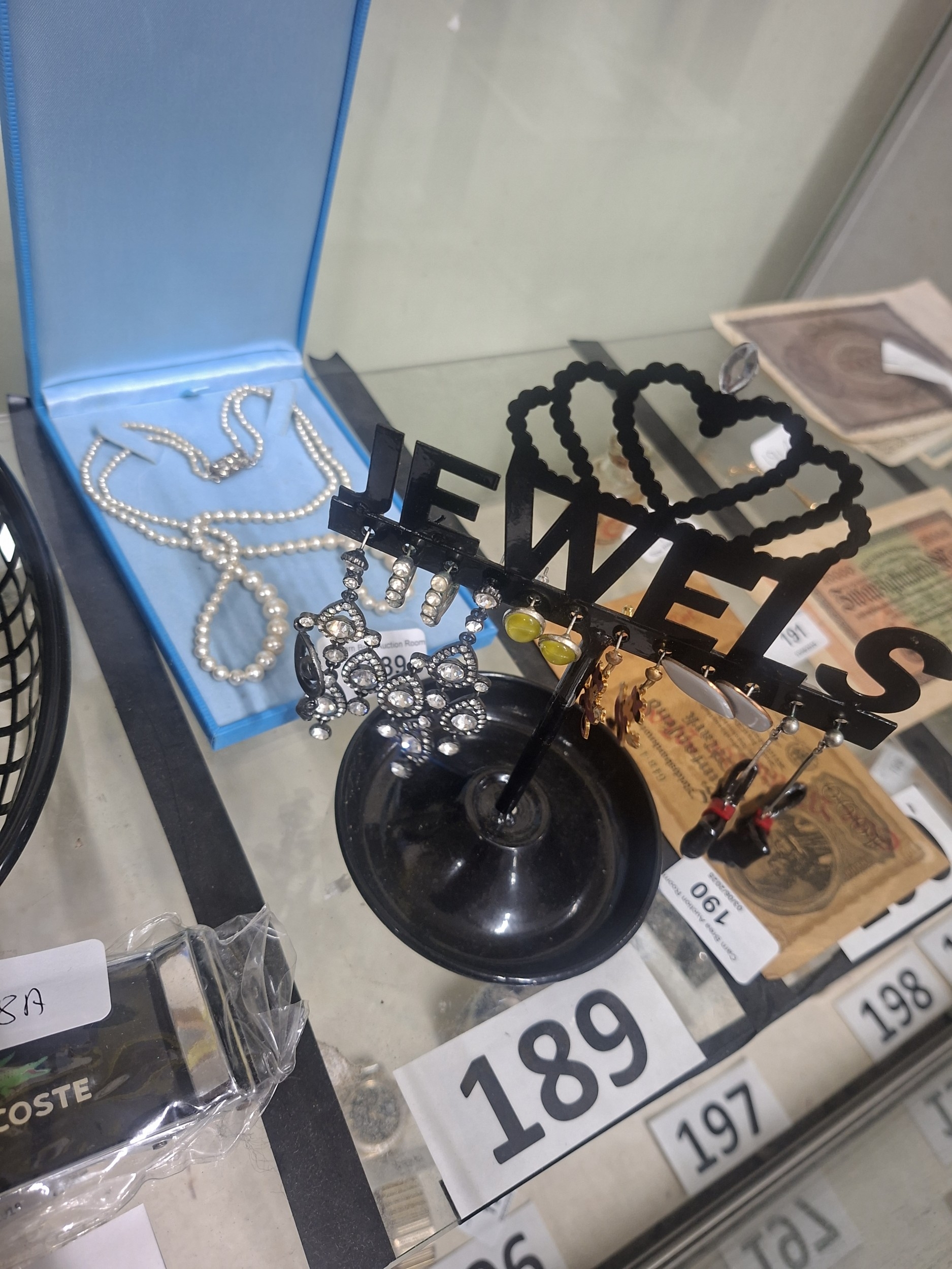 Black metal display stand shaped as “JEWELS” with hooks, displaying assorted earrings and a pearl necklace (in background).