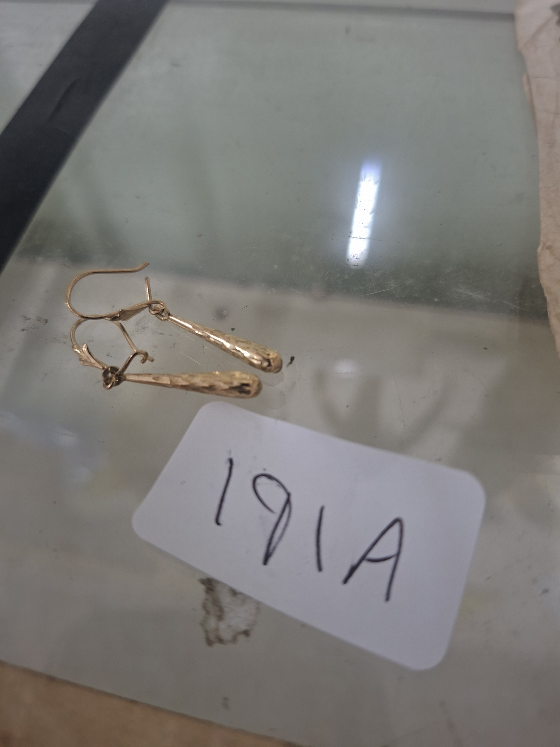 Pair of gold-colored teardrop earrings with textured pendants and wire hooks.