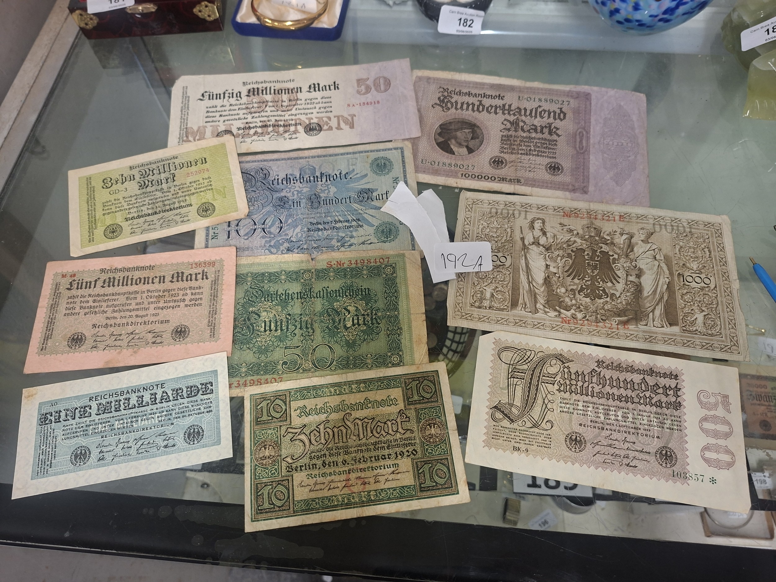 Collection of eight German banknotes from various years during the hyperinflation period, showing wear.