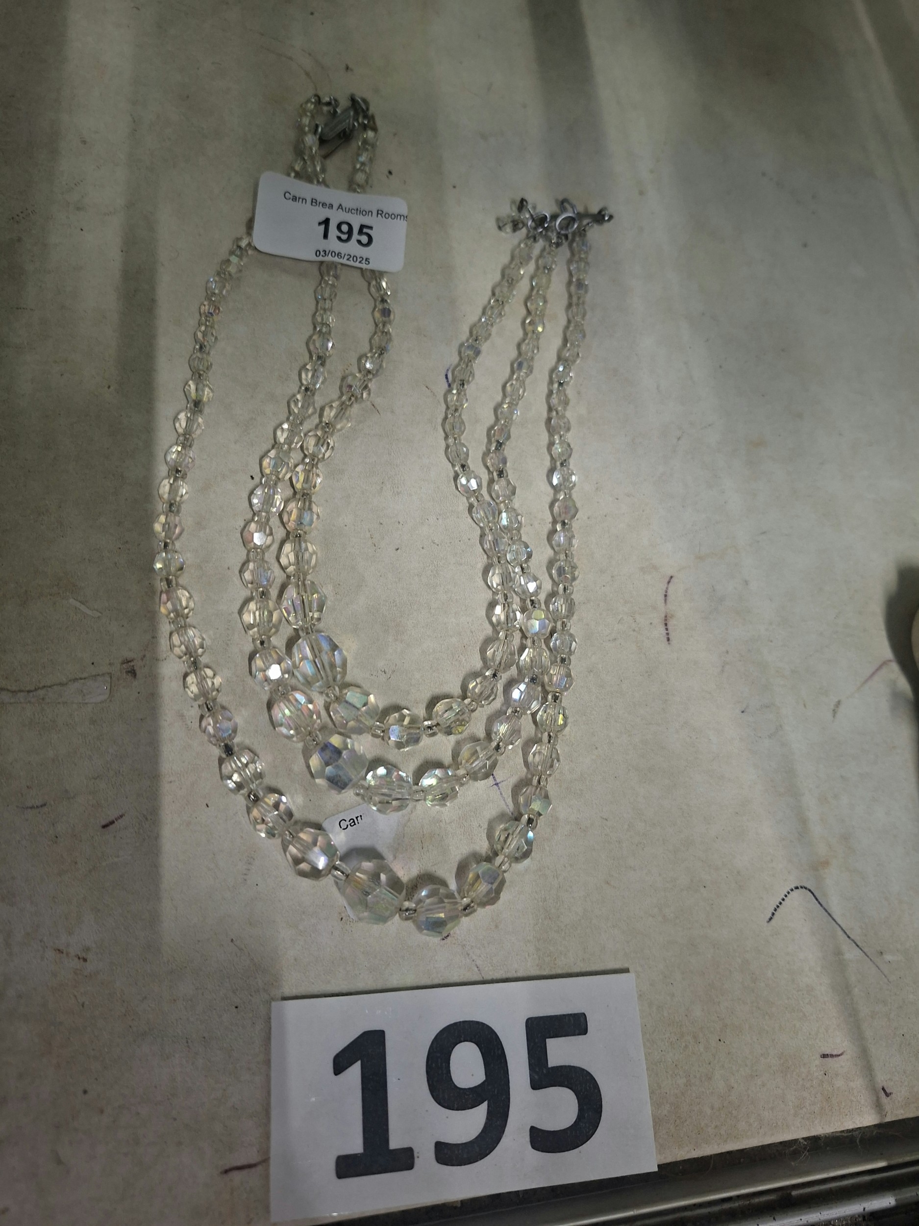 Three-strand necklace of faceted, clear iridescent glass beads on silver-toned wire with two silver clasps.