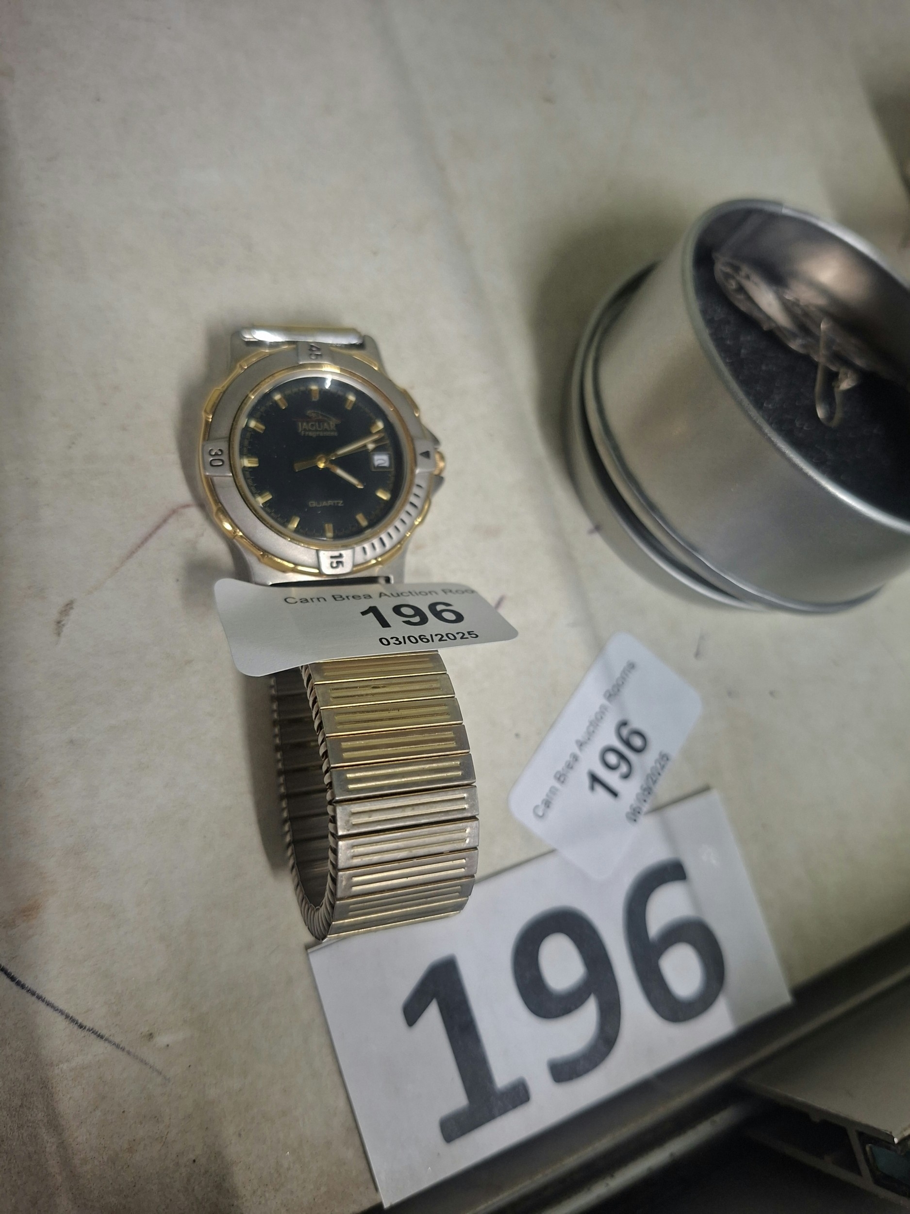 Gold and silver-toned Jaguar Fragranions quartz wristwatch with black face and expandable metal band, showing signs of wear.