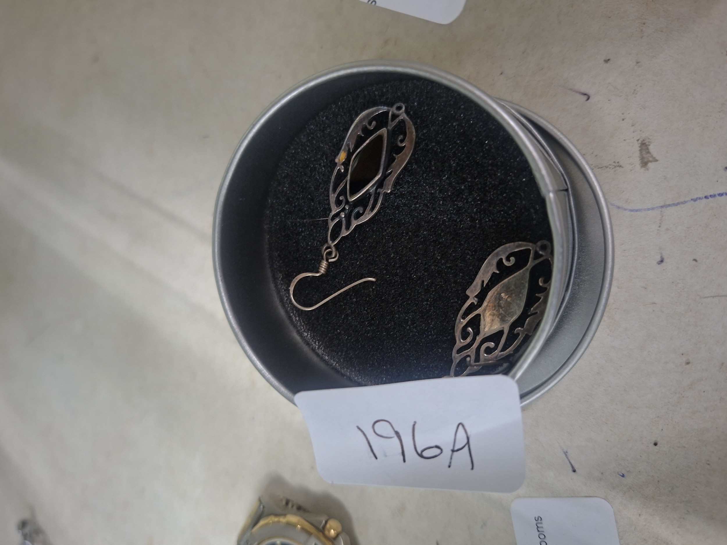 Pair of silver filigree dangle earrings with dark rectangular inlays, presented in a silver tin.