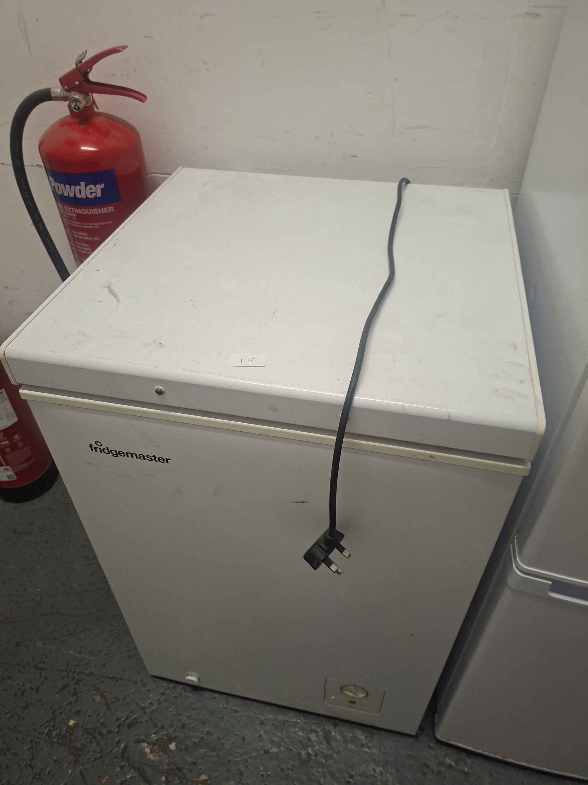 Used white Fridgemaster chest freezer with minor surface imperfections and a UK plug.