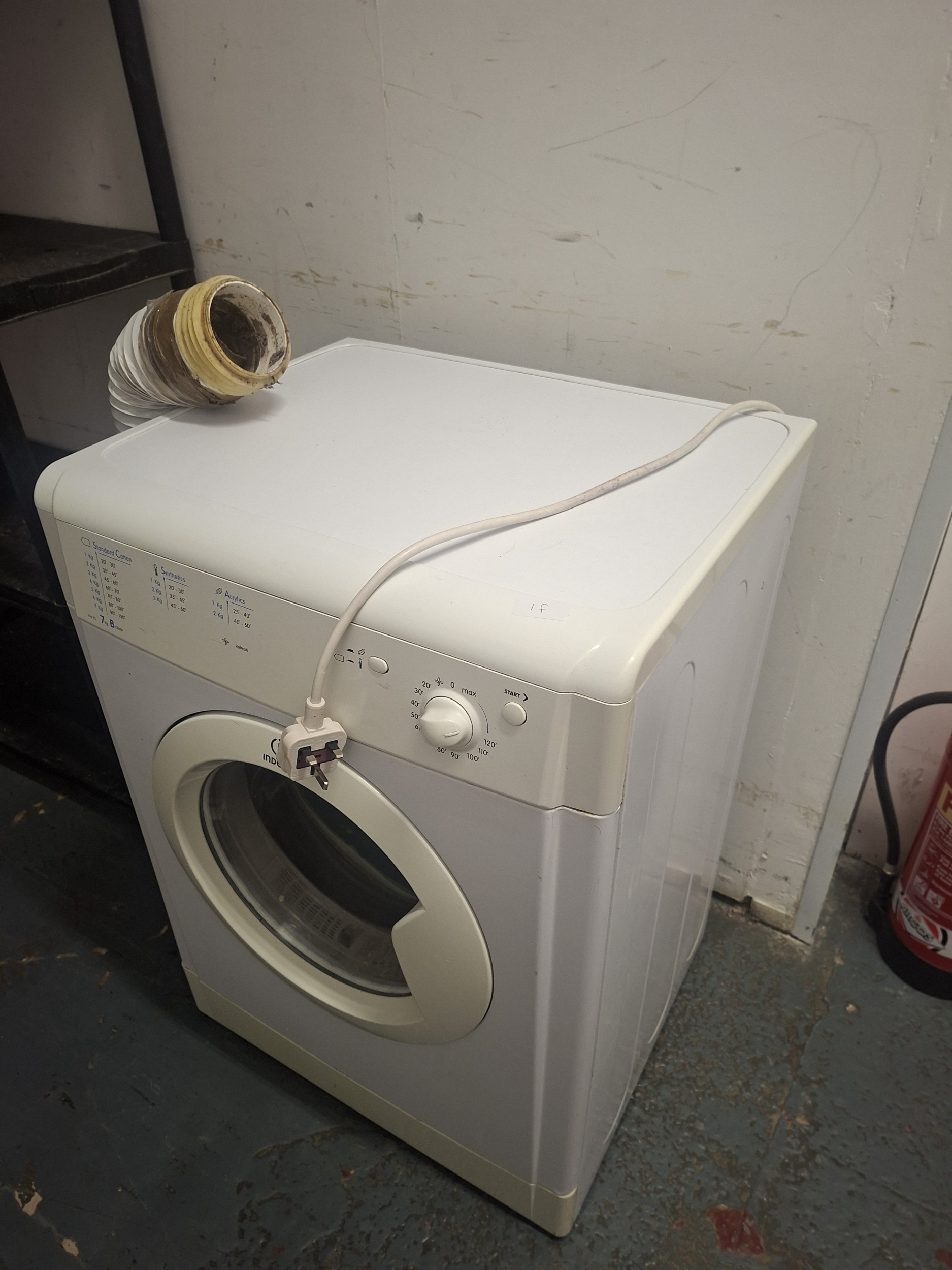 White Indesit tumble dryer with minor surface marks, including a soiled vent hose.