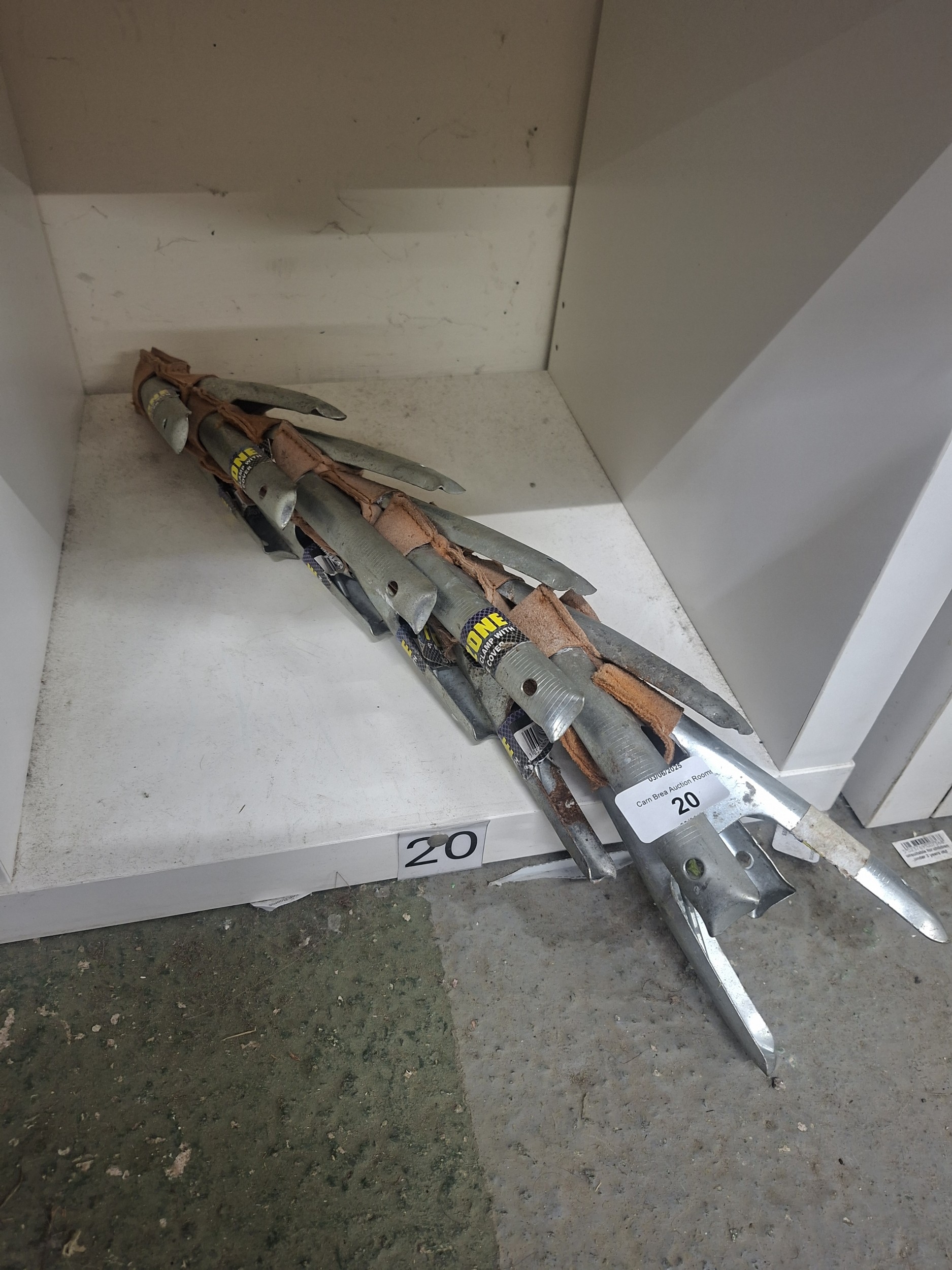 Bundle of approximately twenty galvanized metal tent stakes, individually wrapped in leather, showing minor wear.