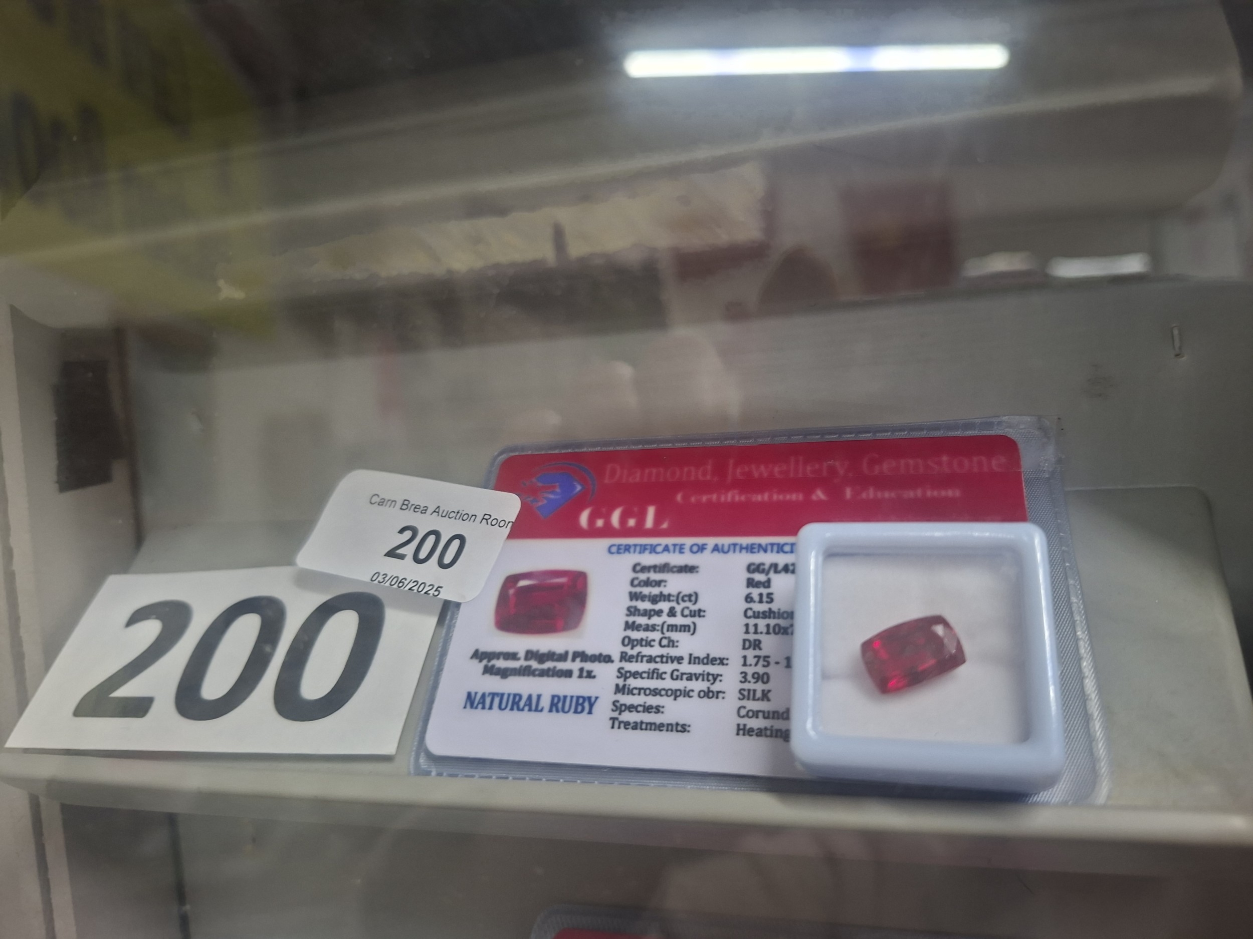 A 6.15-carat natural ruby with cushion cut is presented in a plastic case with certificate.