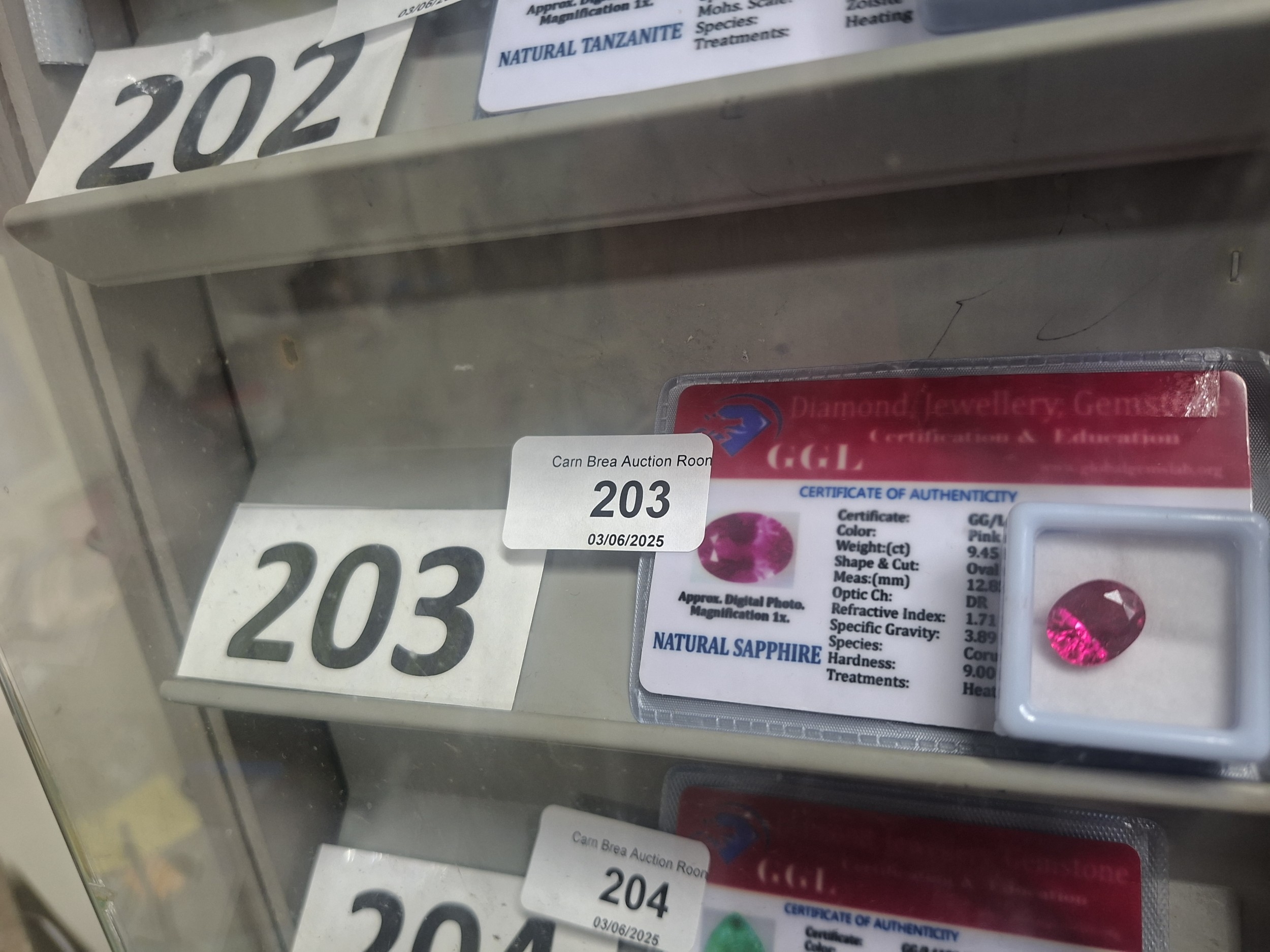 A 9.45-carat natural pink sapphire with certificate, in display case.