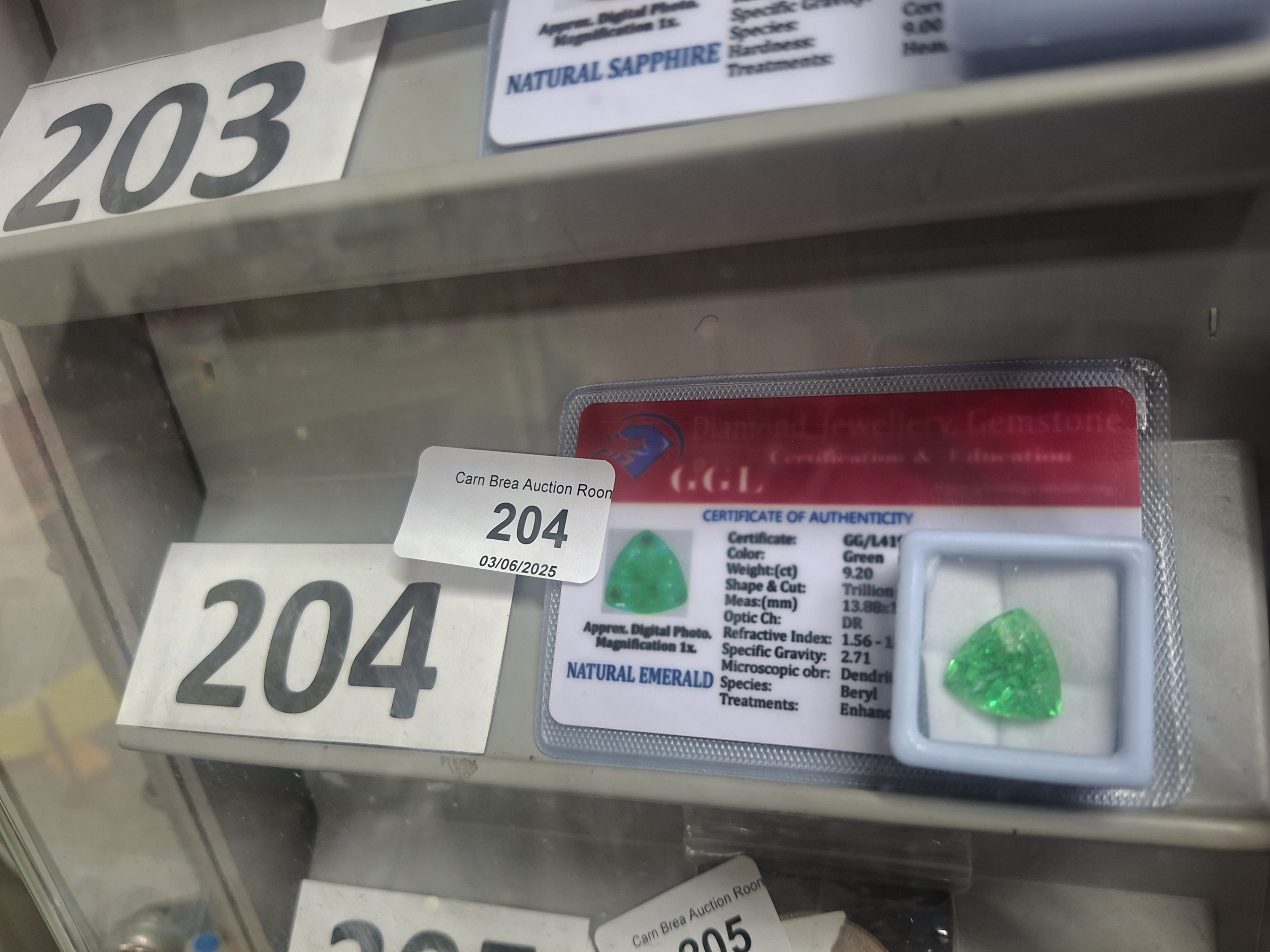 A 9.20-carat green beryl (emerald) with inclusions, trillion cut, in plastic case with certificate.
