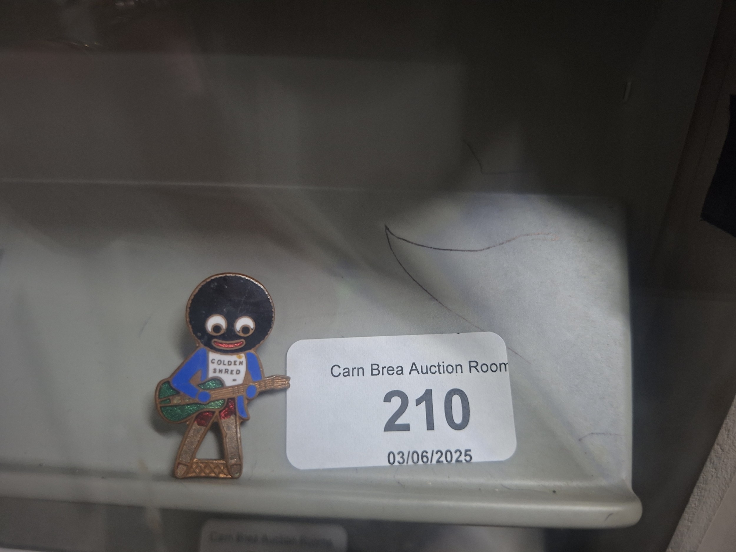 Metal pin depicting a cartoon guitarist with minor wear.