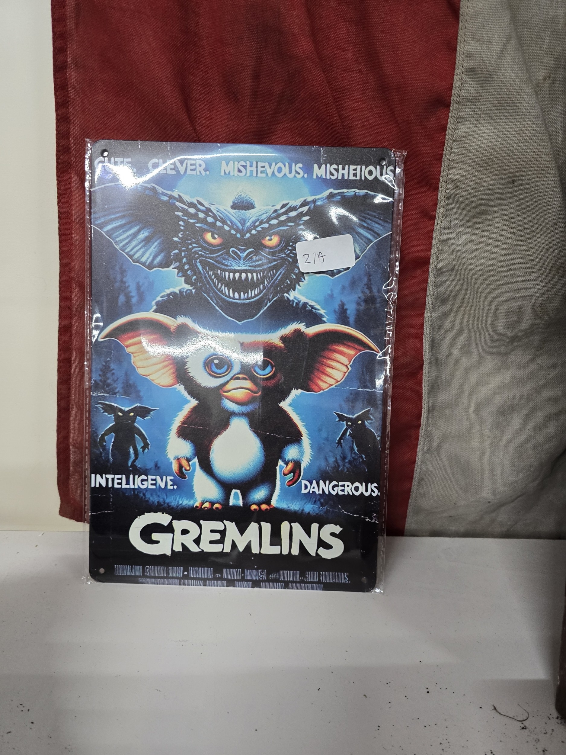 Rectangular metal sign featuring Gremlins movie poster artwork with descriptive text.