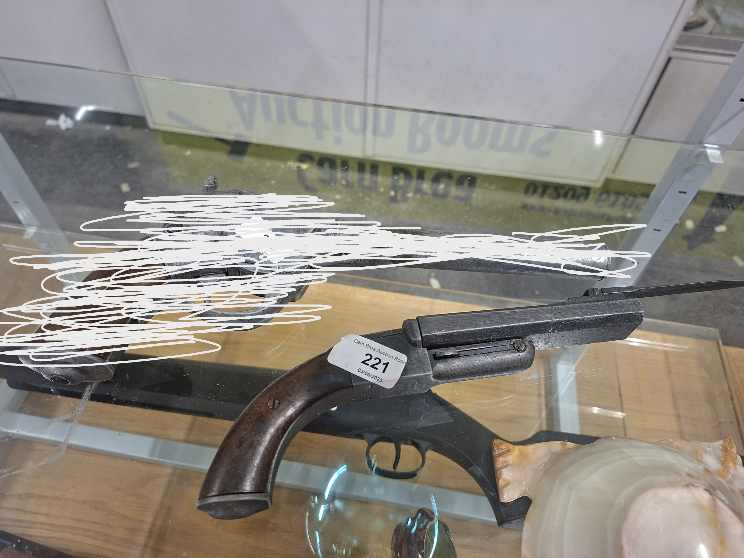 Two aged firearms, one dark gray metal with wood grip, the other metallic gray, showing wear.