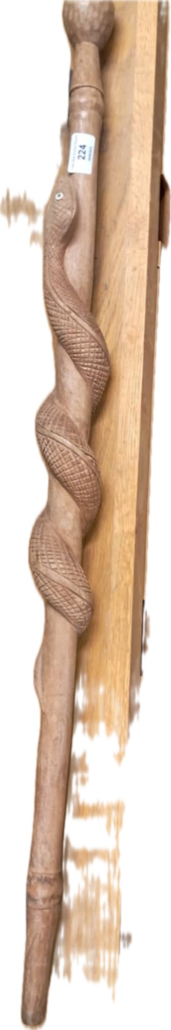 A light brown wooden walking stick with a carved snake design, showing minor wear.