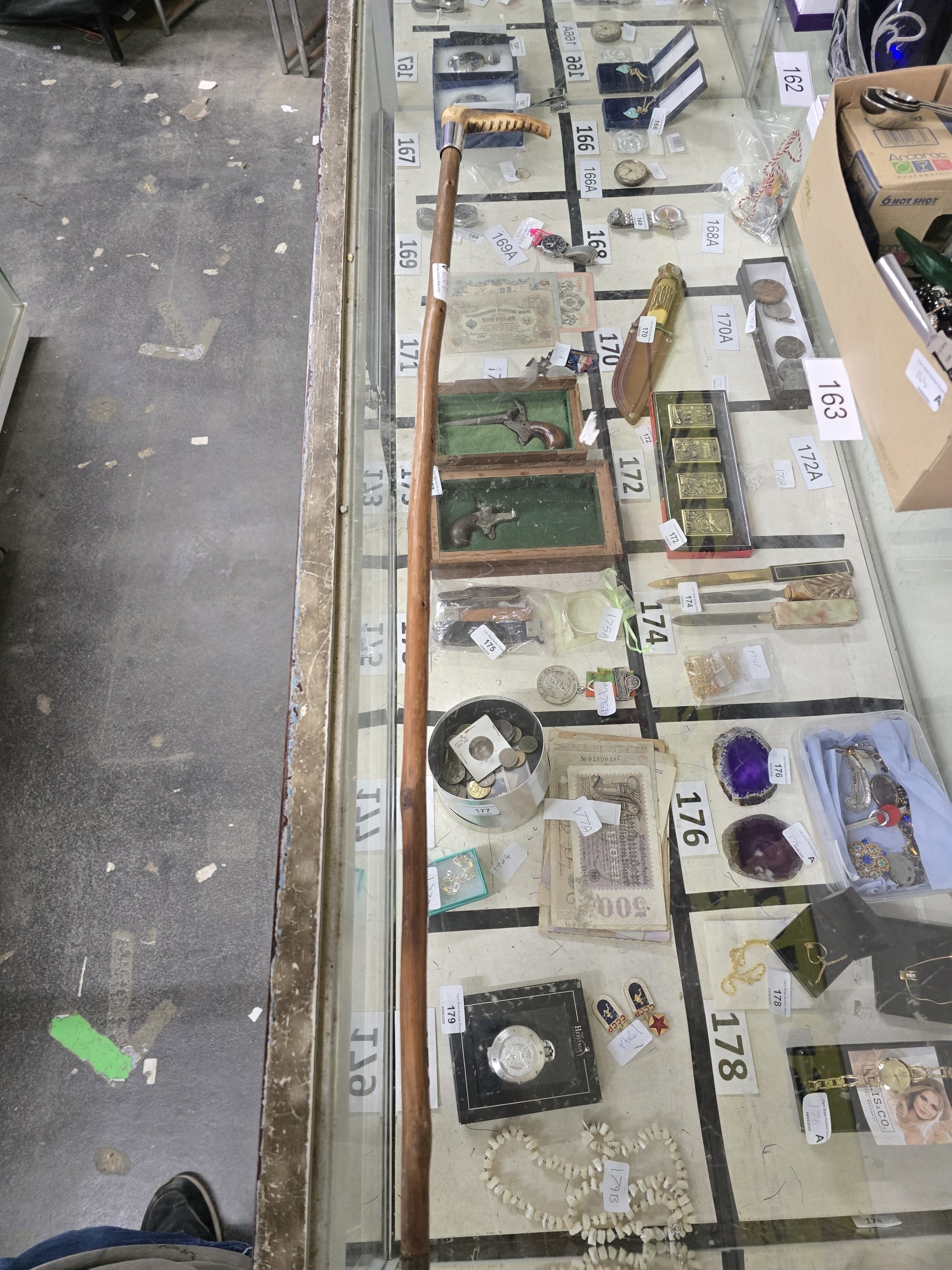 A curved wooden walking stick with a light-colored antler handle and silver band.