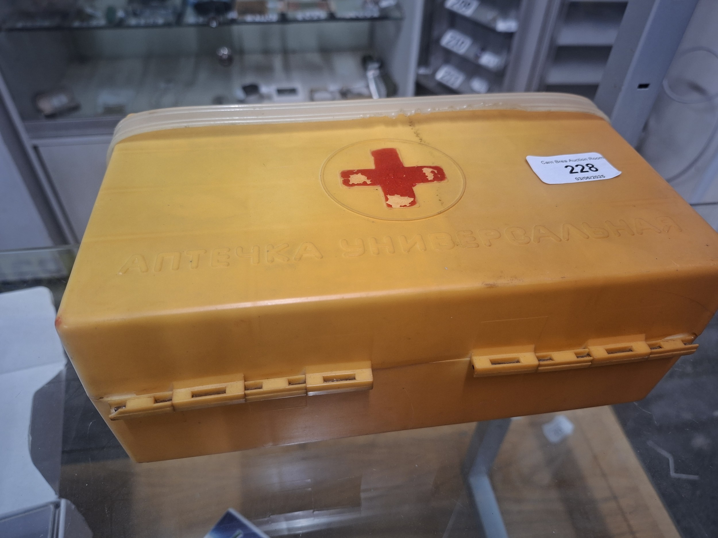 Mustard yellow plastic first-aid kit with Cyrillic lettering and red cross, showing minor wear.