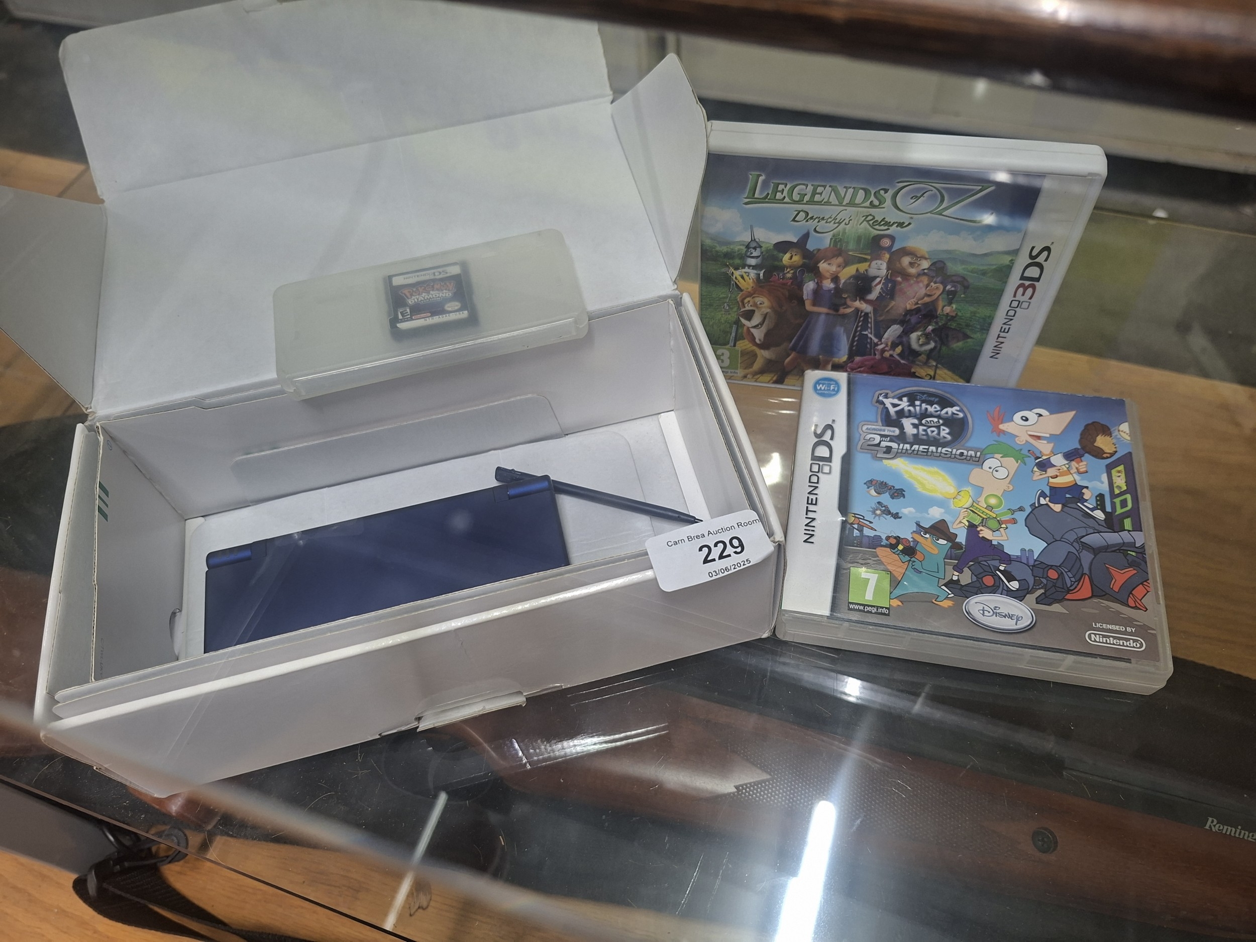 Nintendo 3DS console with stylus, three game cartridges (Pokemon Diamond, Legends of Oz, Phineas and Ferb), and accessories in box.