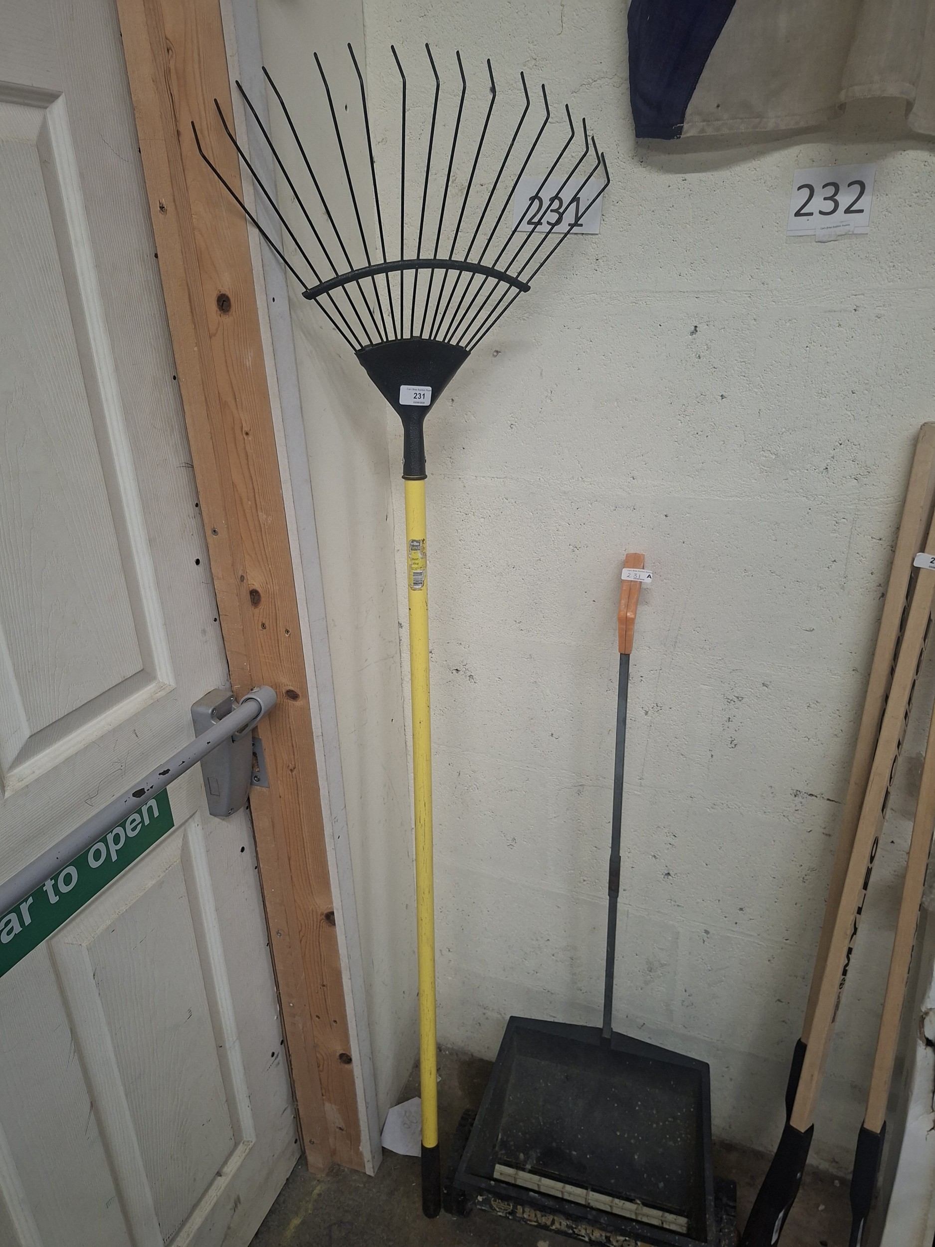 A used but intact leaf rake with a yellow handle and black metal tines.