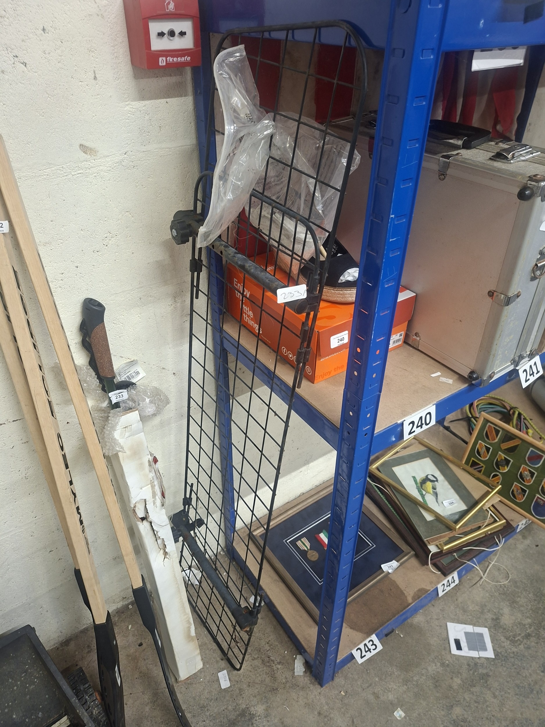 A used, black metal gridded partition with brackets, showing some discoloration.