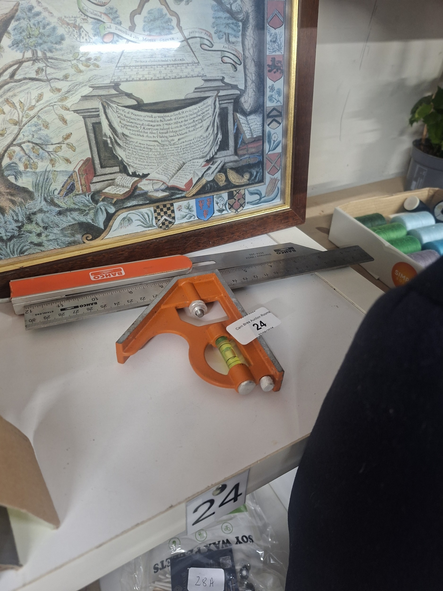 A framed landscape print with visible text and small emblems, accompanied by two BAHCO try squares (one with a level) and a ruler.