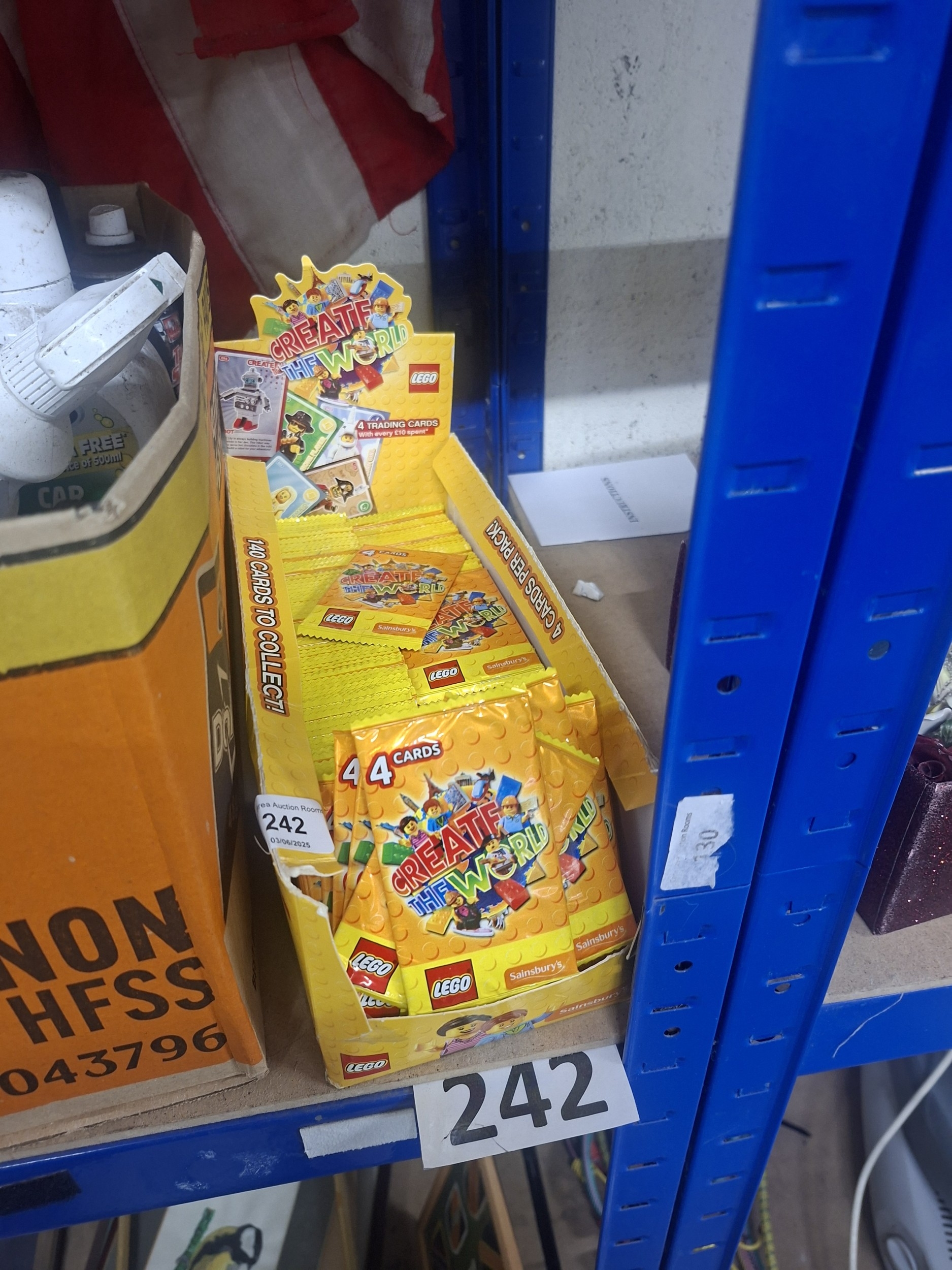 A sealed cardboard display box containing 140 LEGO Create the World trading cards from Sainsbury’s.