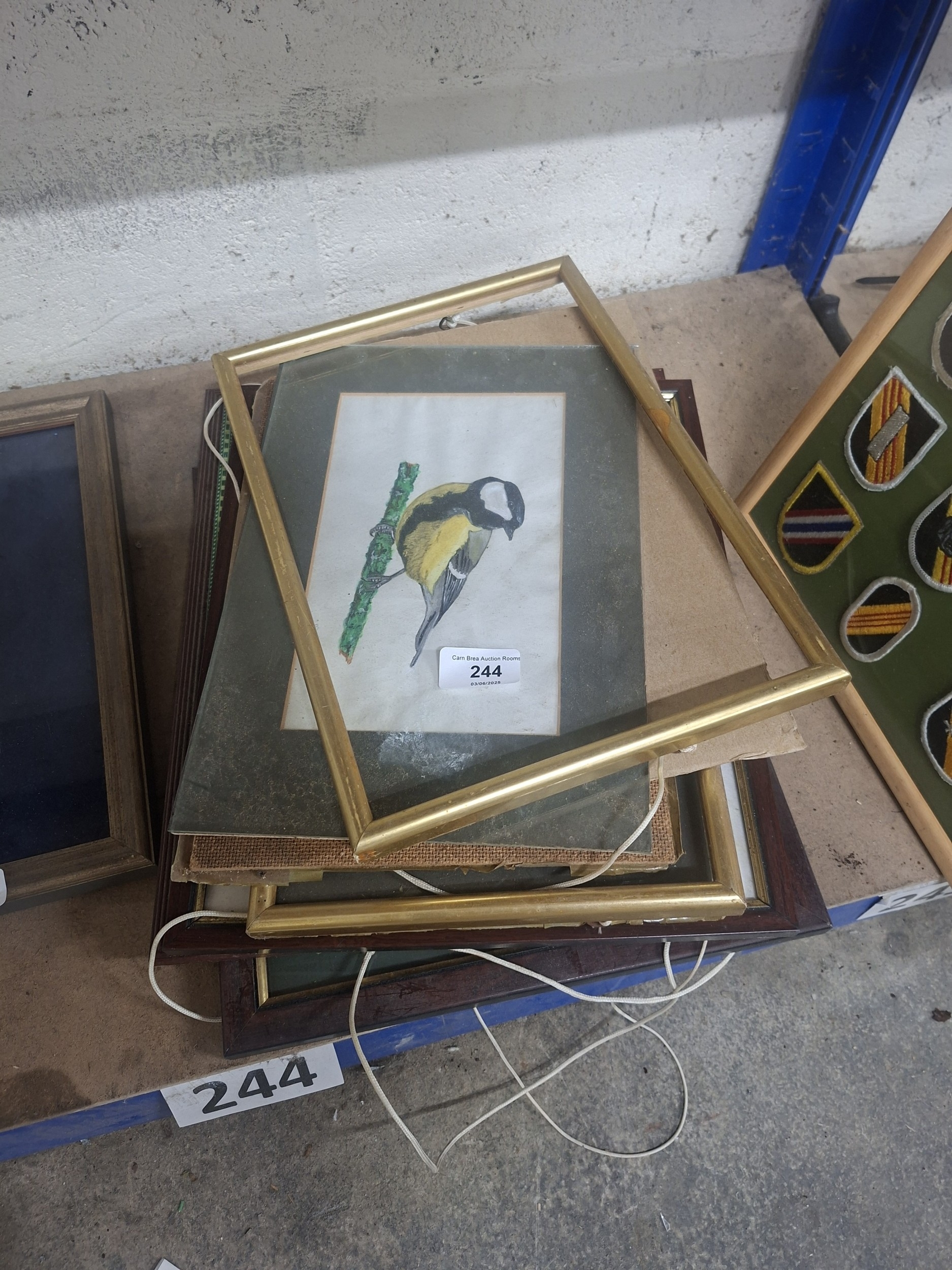 A stack of framed pictures, including a bird print, tied together with string, showing minor wear.