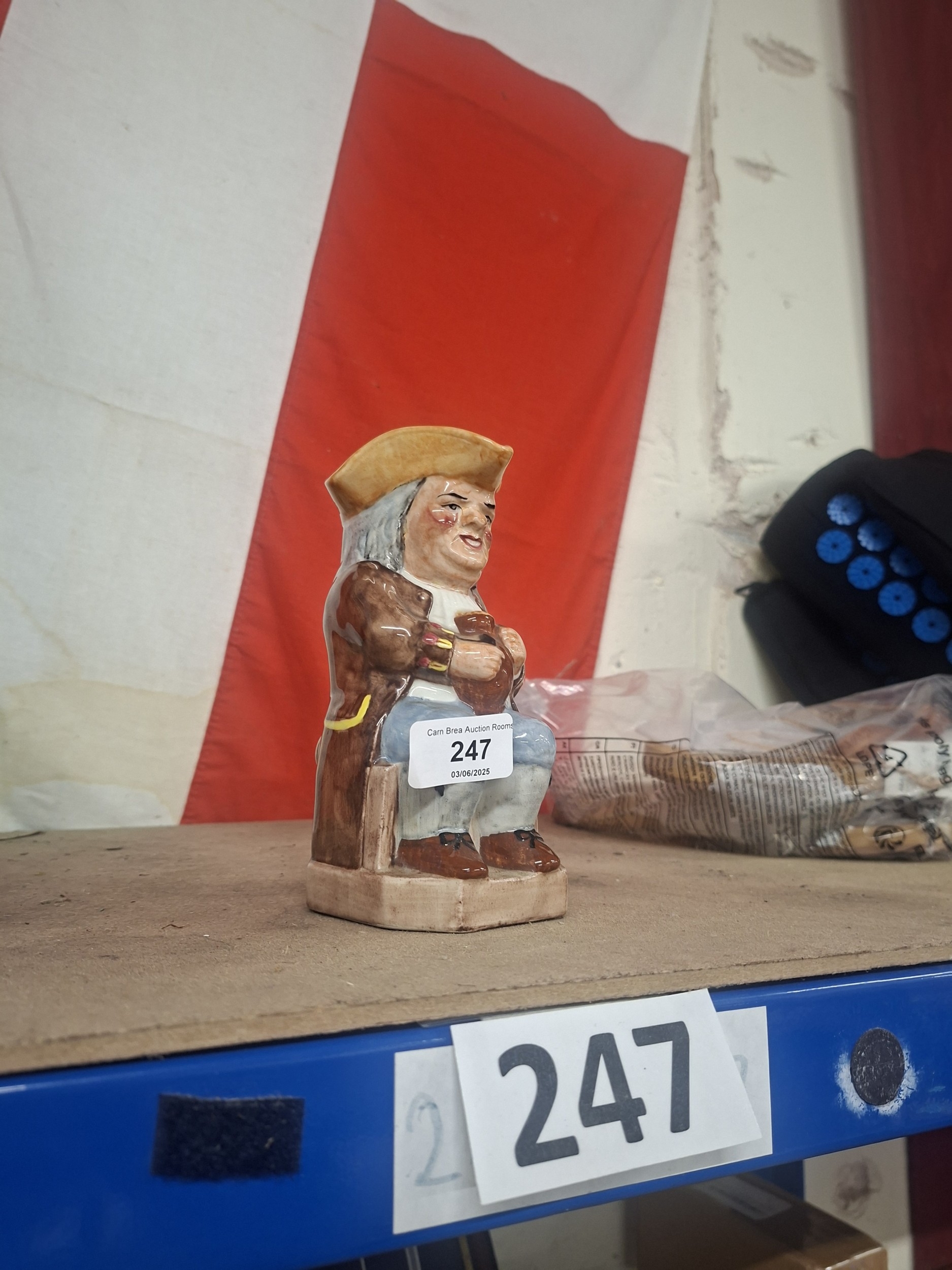 A ceramic figurine depicts a seated man in 18th-century clothing, holding a mug.