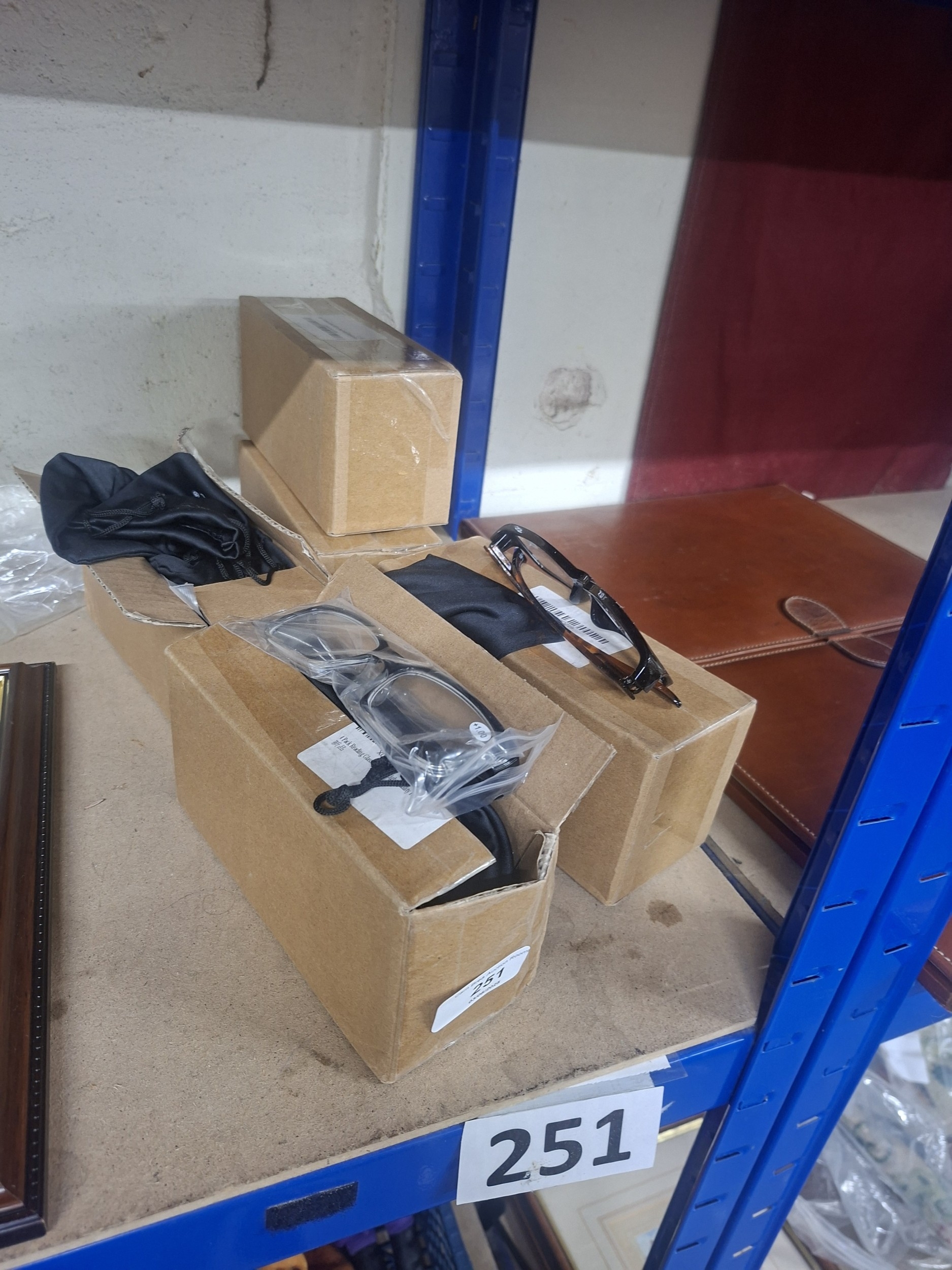 Two pairs of eyeglasses, one tortoise-shell, one black, each in a box with case.