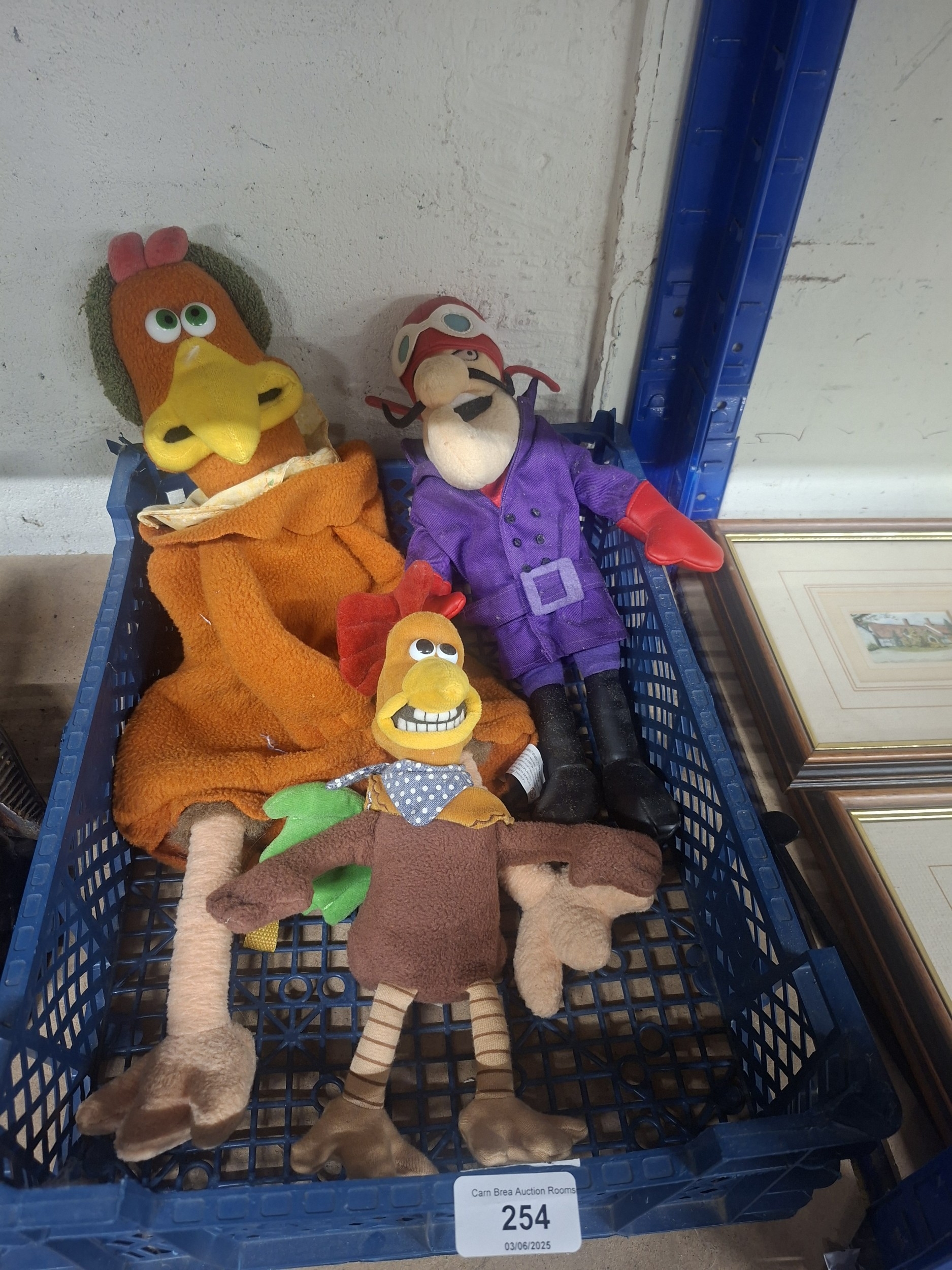 Lot contains three plush toys (chicken, chicken, aviator) showing wear, in a blue plastic crate.