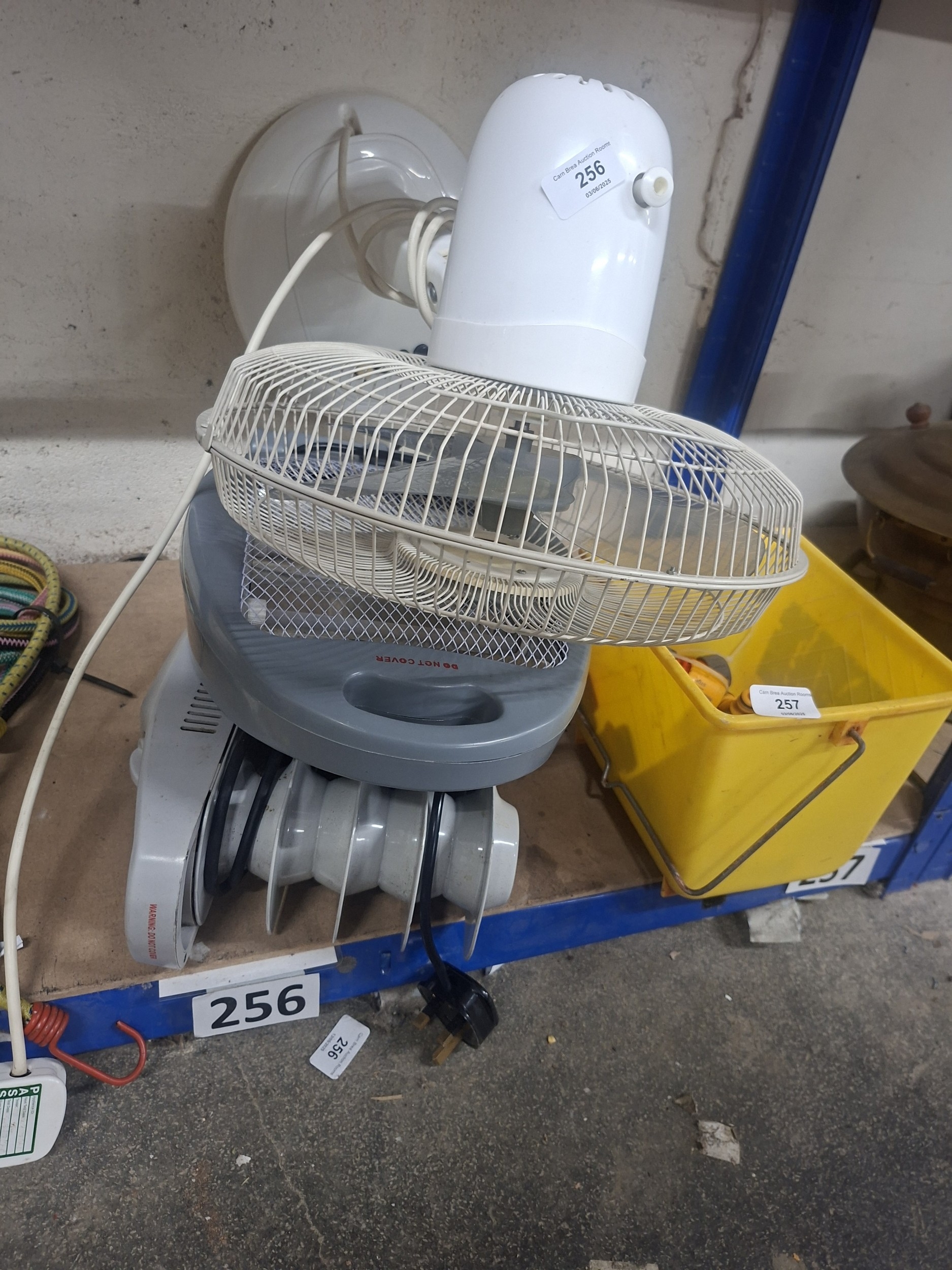 Lot includes a white dome fan, a gray handled fan with visible dirt, and a partially visible yellow bucket.