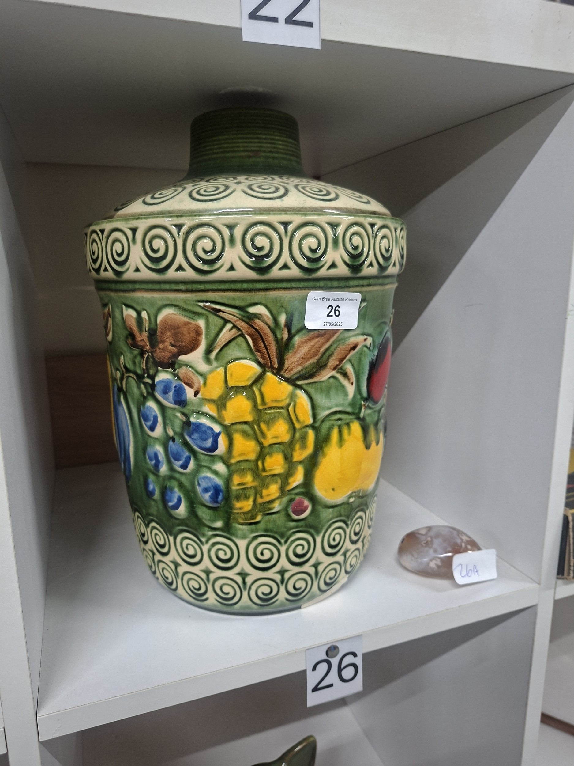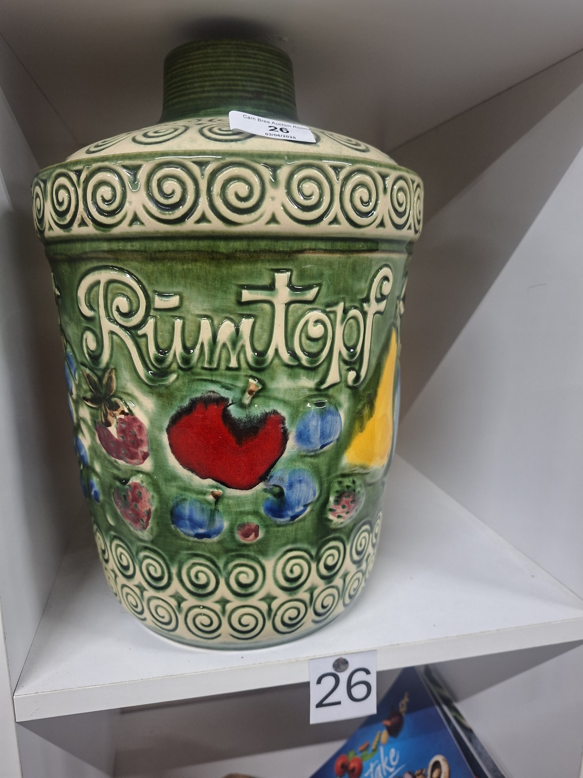 A decorative ceramic jar with lid, featuring fruit motifs and the word “Rumtopf,” in good condition.