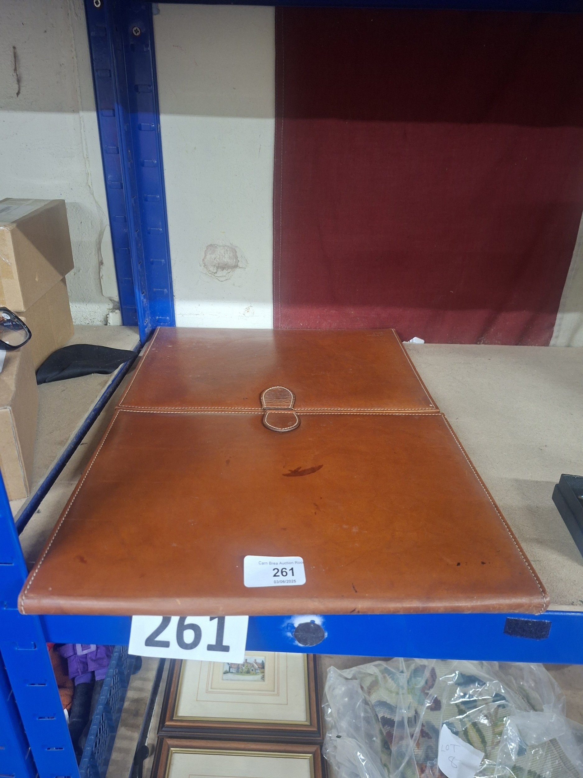 A rectangular light brown leather portfolio with minor discoloration, showing visible stitching and a small clasp.
