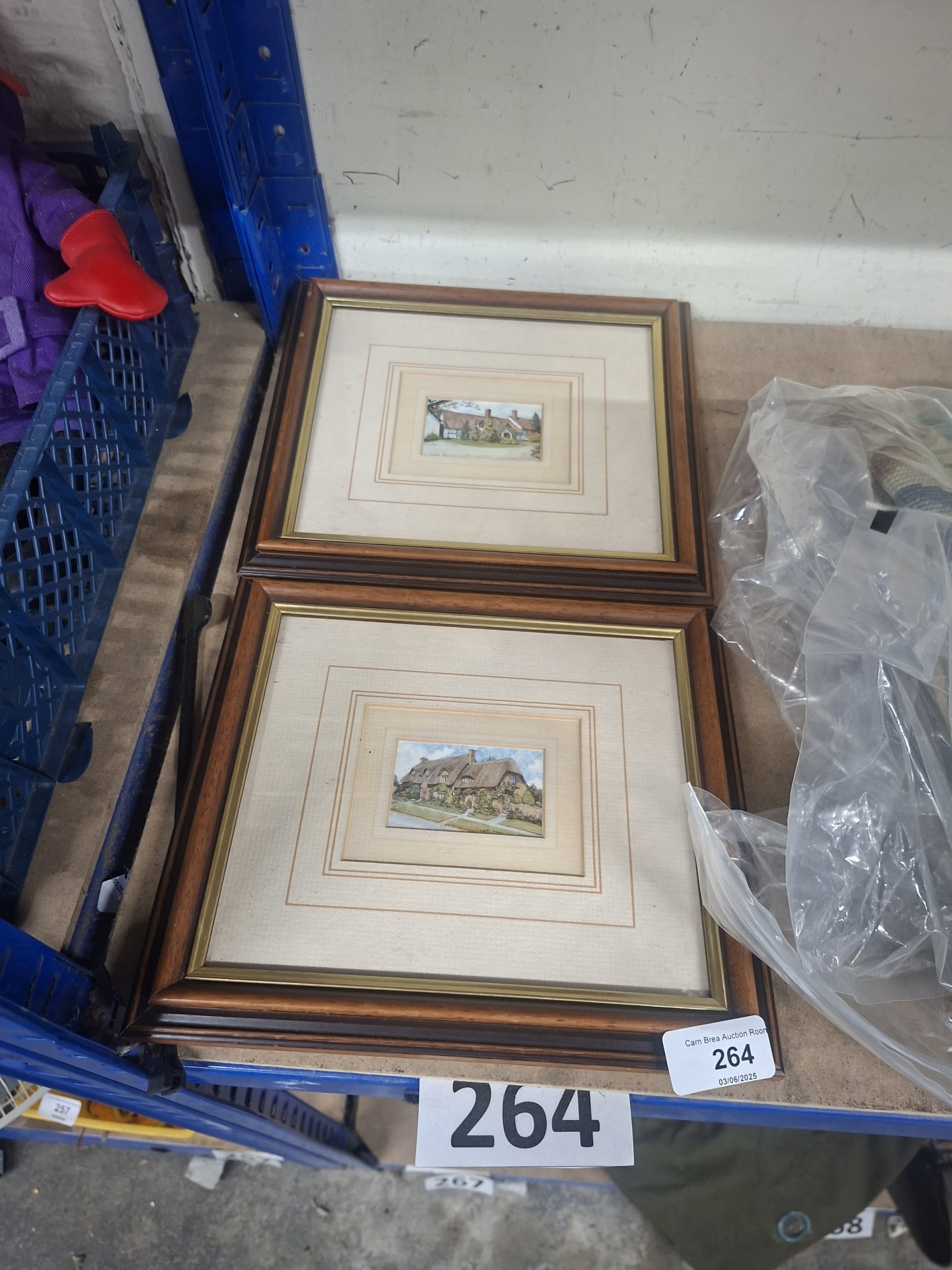 Two framed watercolor paintings of thatched cottages, minor wear to frames.