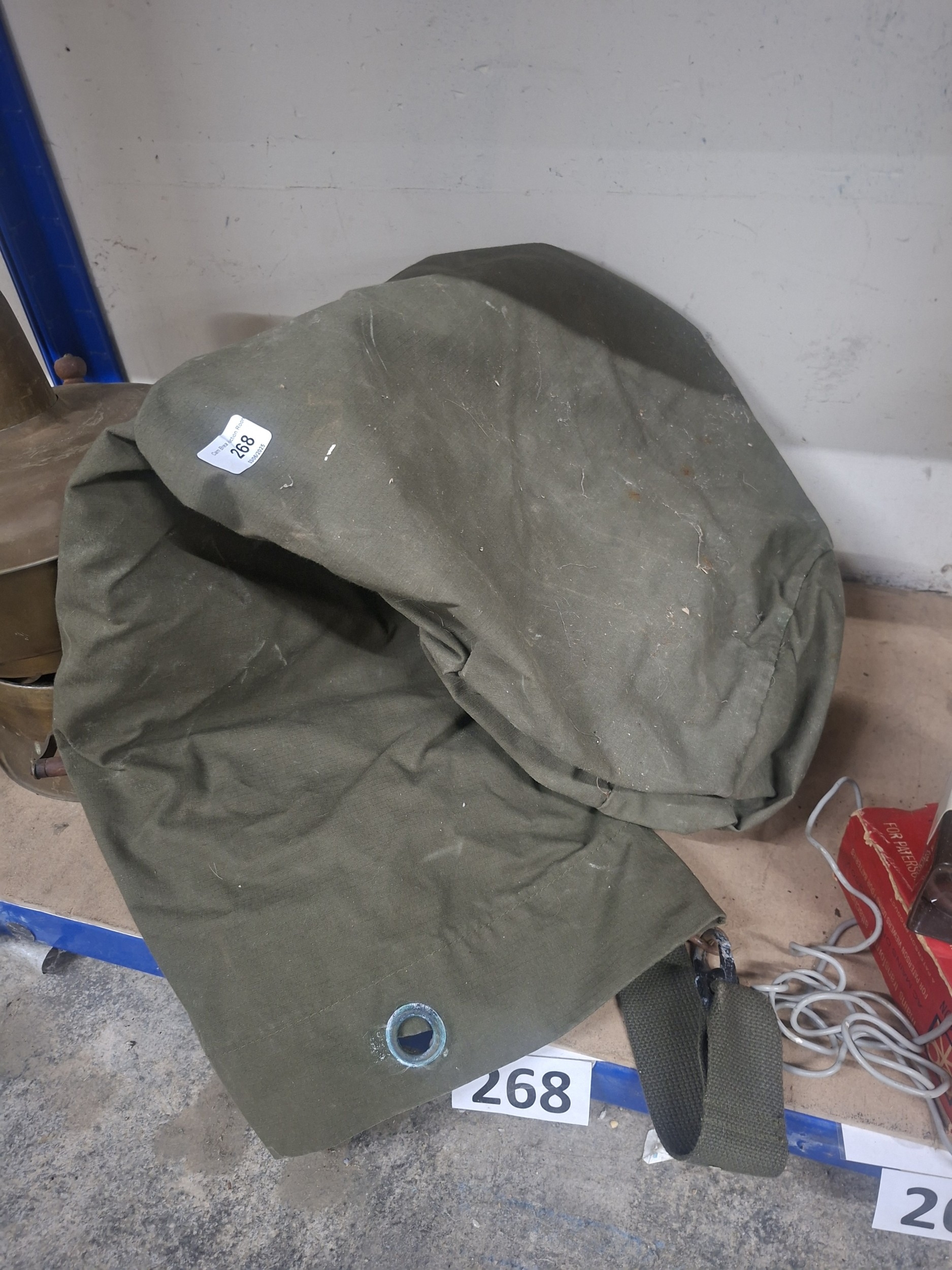 A used, cylindrical olive-green canvas bag with wear, dirt, and a shoulder strap.