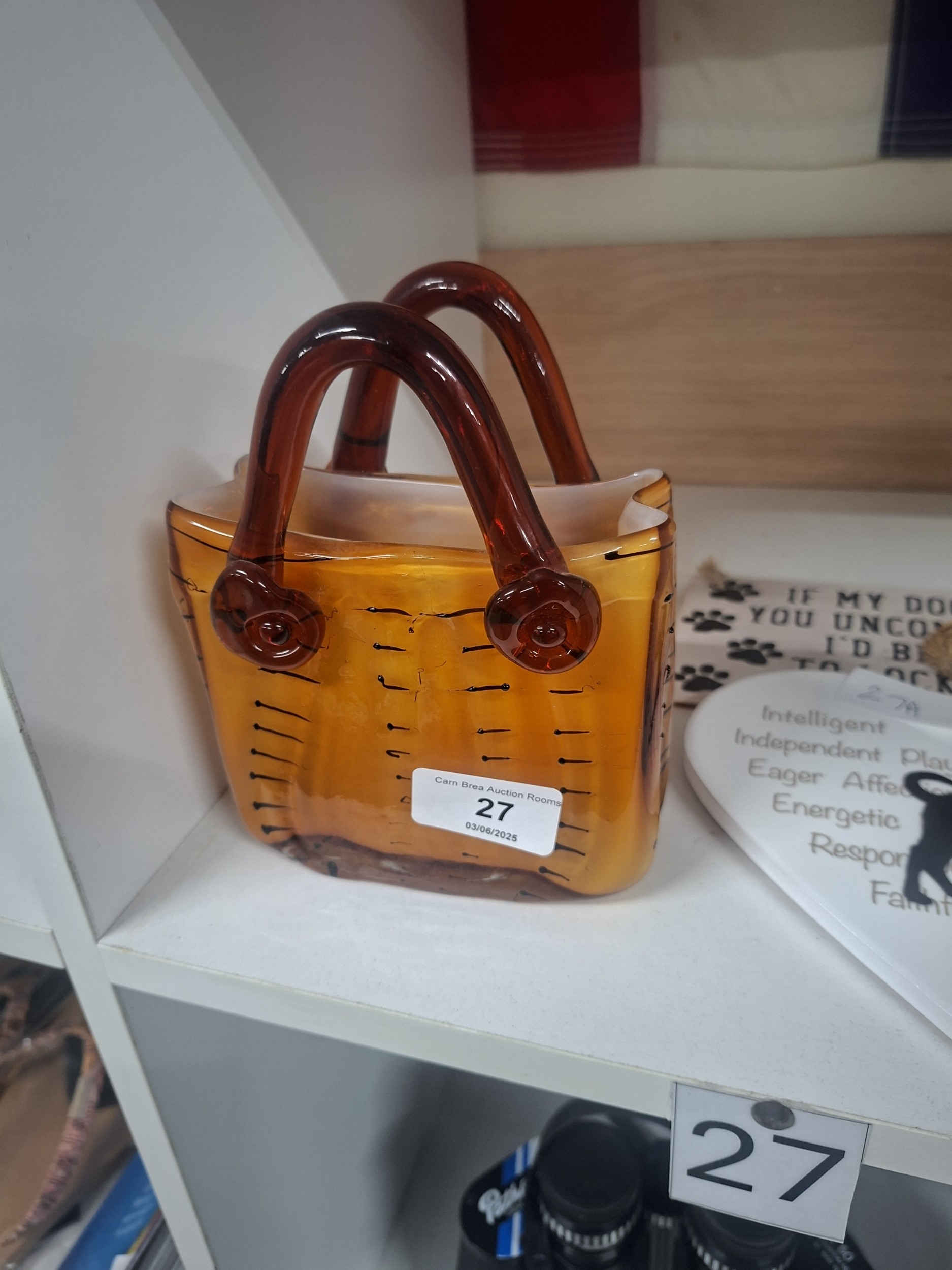 Amber glass handbag-shaped decorative object with darker amber handles and accents.