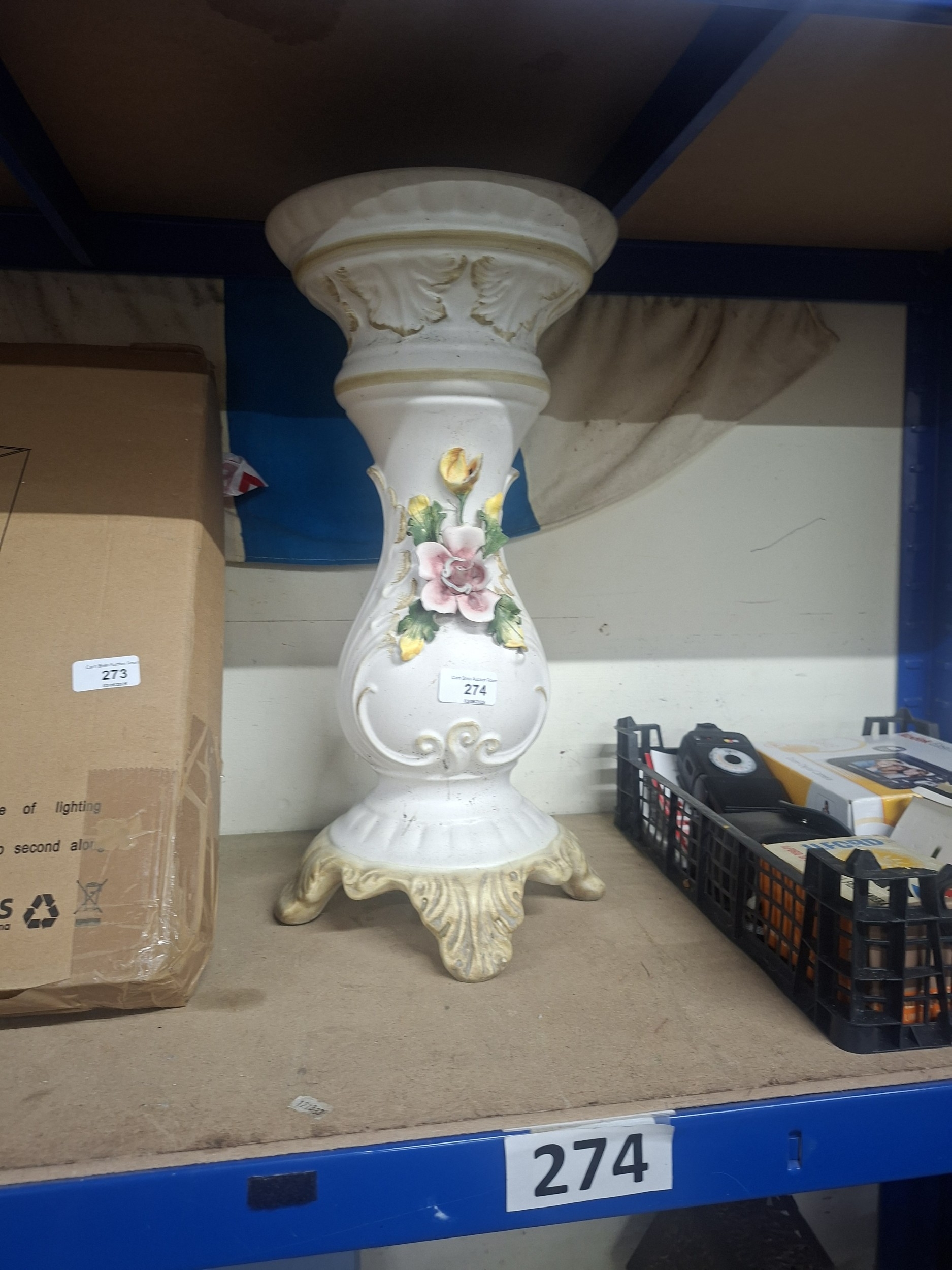 An off-white ceramic pedestal stand with beige accents and a pink and yellow rose floral motif shows some wear.