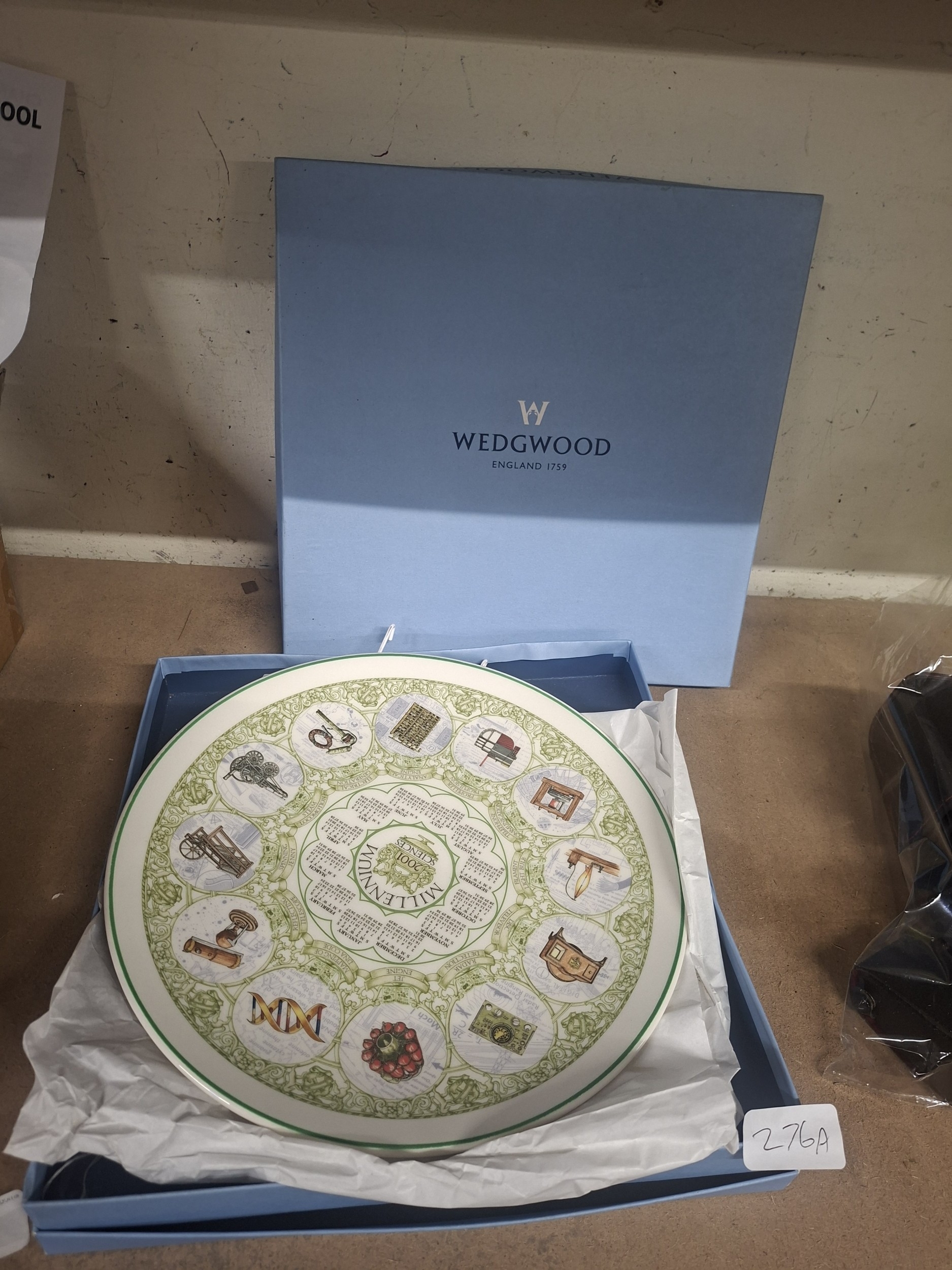 Wedgwood plate with a green and black circular design featuring scientific inventions and a 2001 Millennium Sciences calendar, in original box.