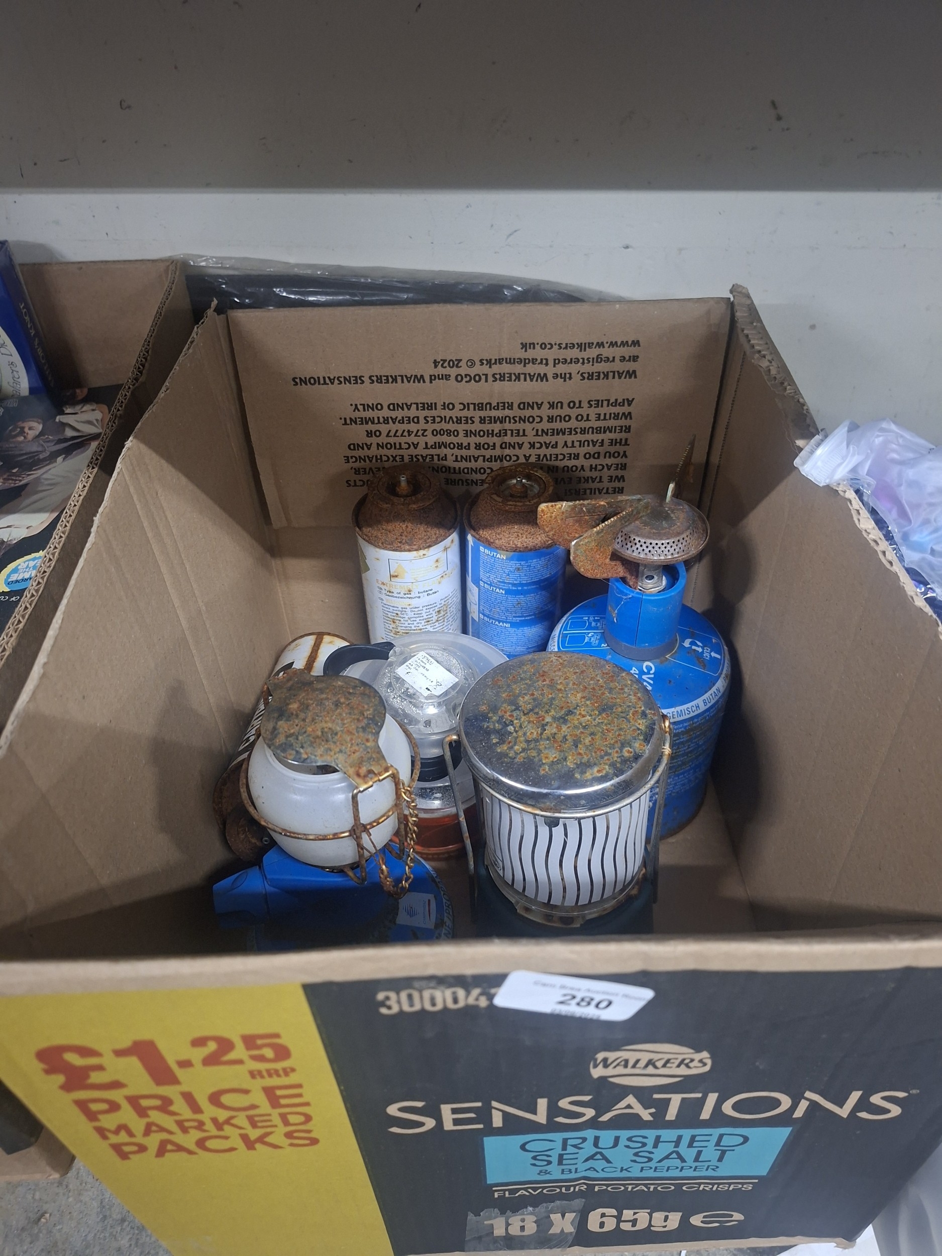 A cardboard box containing rusty, vintage camping fuel canisters and lanterns.