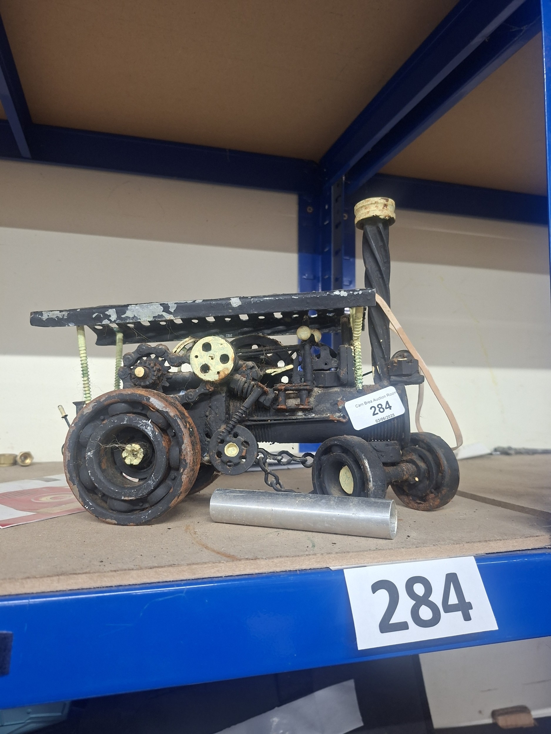 A small, dark metal model of a steam traction engine with visible wear and some paint.