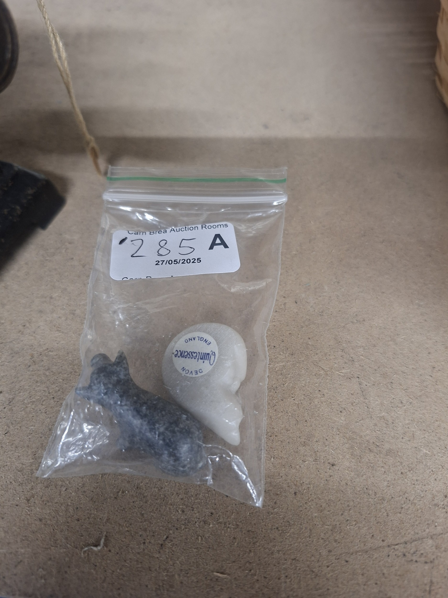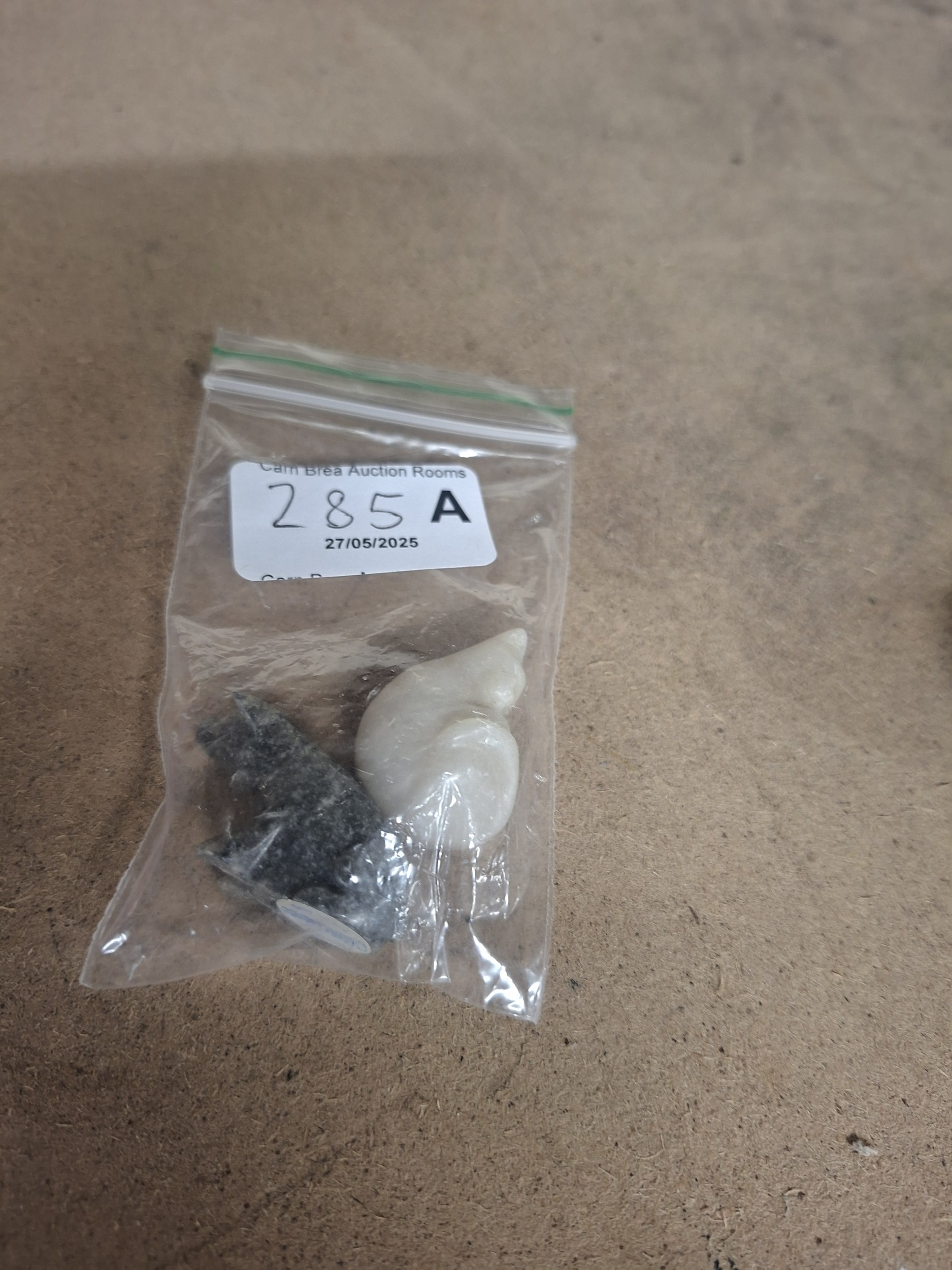 Two small, smooth, possibly polished stone figurines in a zip-top bag, one stylized animal, one abstract.