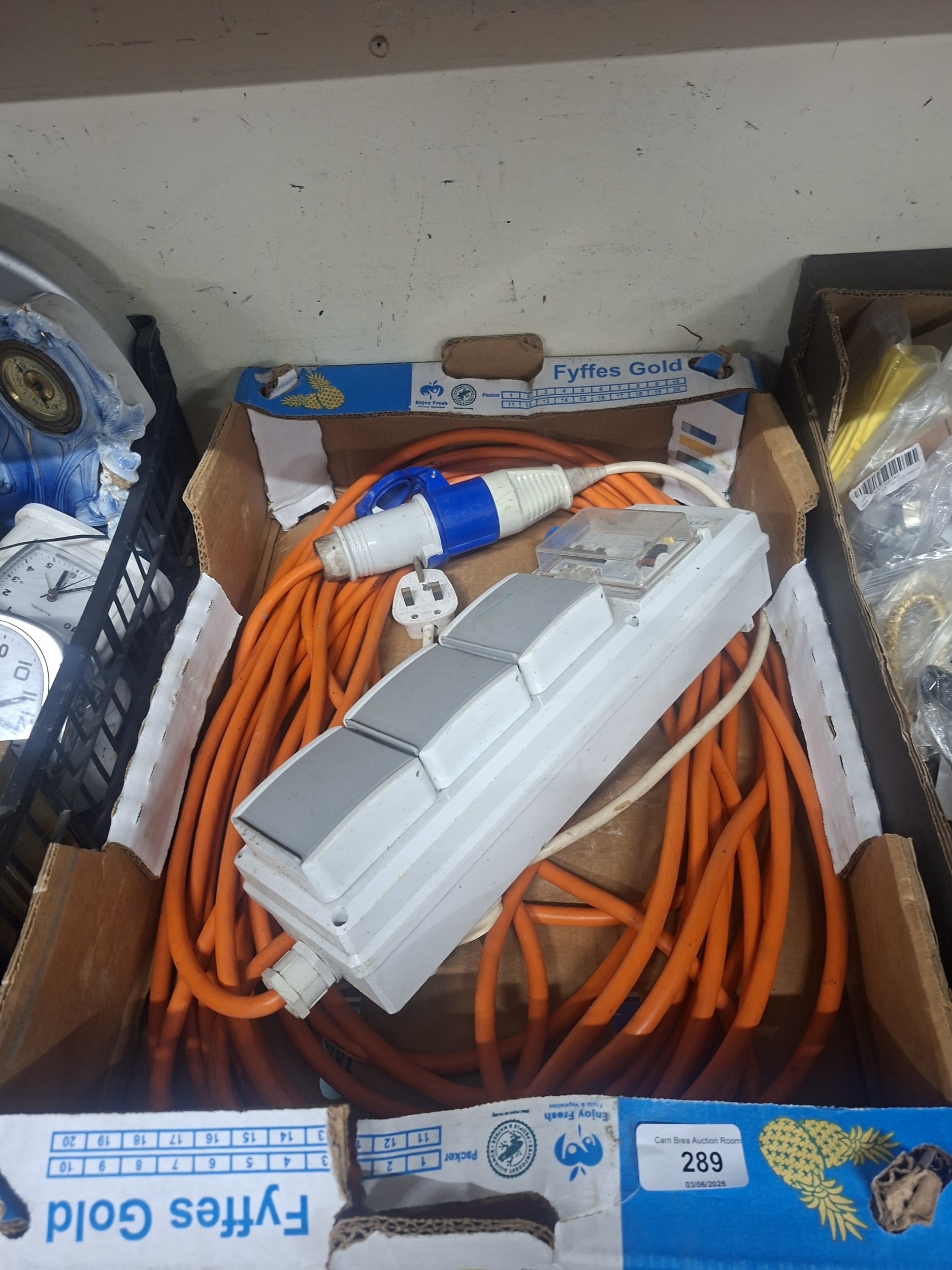 Used but intact white 4-gang extension lead with orange cable in a box.