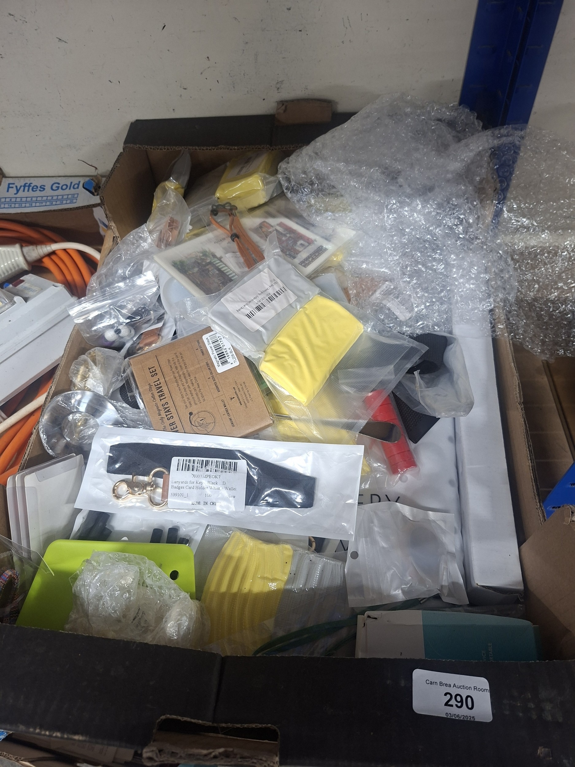 A cardboard box contains various new and used items including lanyards, collar stays, and other miscellaneous objects.