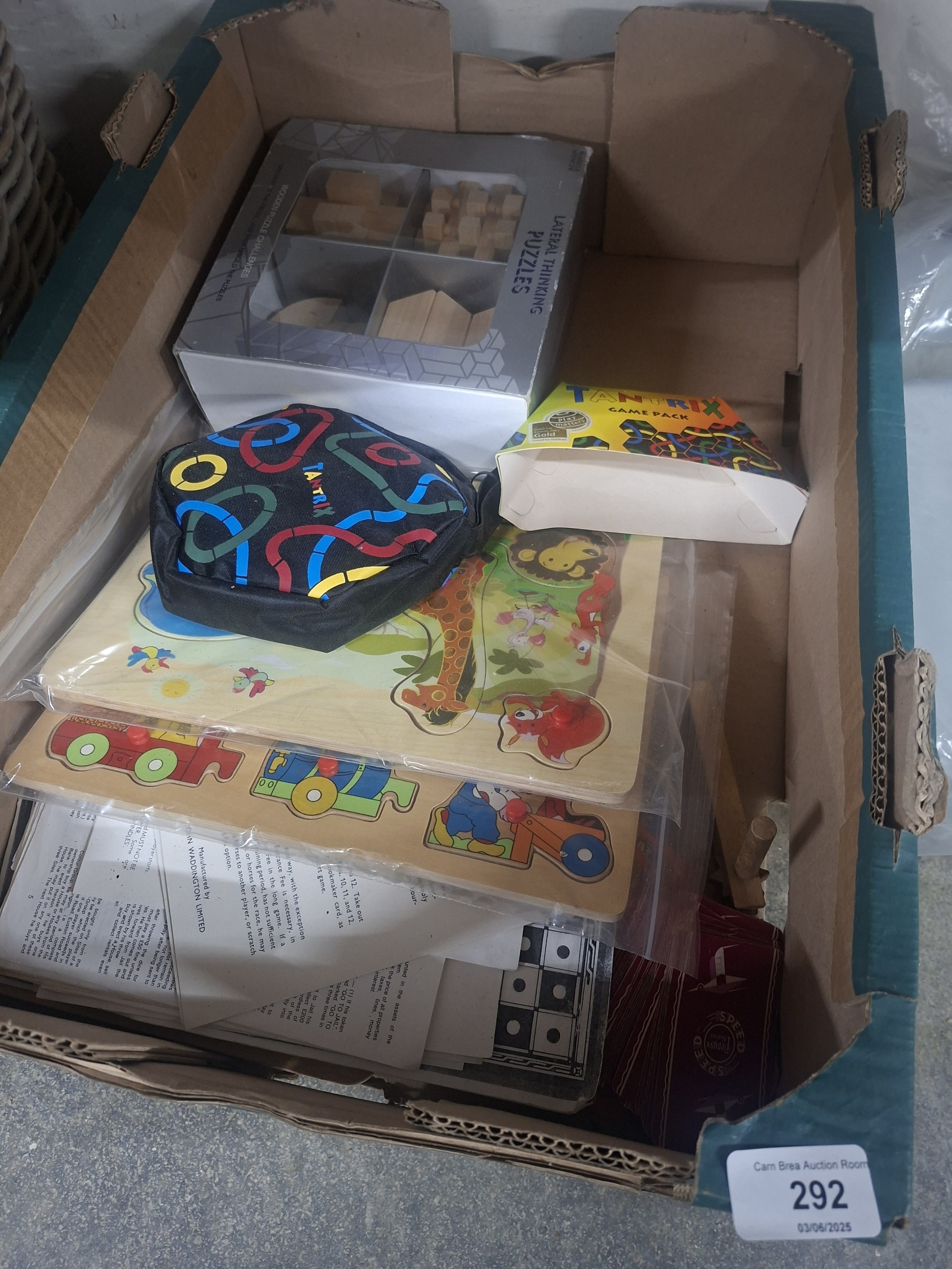 Teal box containing various puzzles and games including Lateral Thinking Puzzles, Tantrix, and jigsaw puzzles.