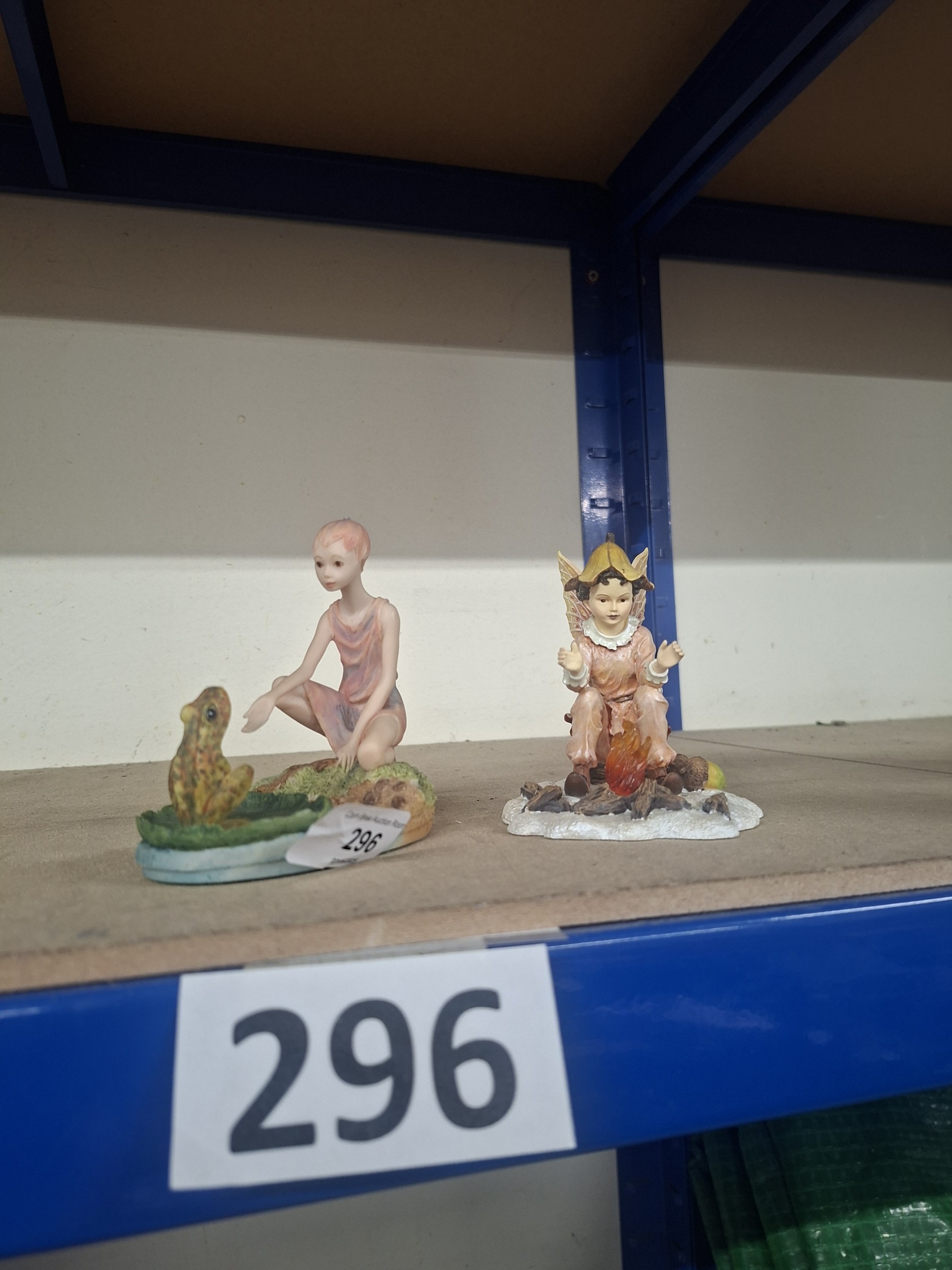Two resin fairies, one with a frog, the other near a fire, appear in good condition.